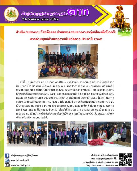 สำนักงานแรงงานจังหวัดตาก ร่วมตรวจสอบแรงงานกลุ่มเสี่ยงเพื่อป้องกันการค้ามนุษย์ด้านแรงงานจังหวัดตาก ประจำปี 2562