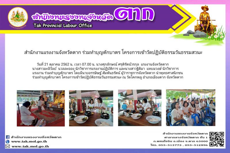 สำนักงานแรงงานจังหวัดตาก ร่วมทำบุญตักบาตร โครงการเข้าวัดปฏิบัติธรรมวันธรรมสวนะ