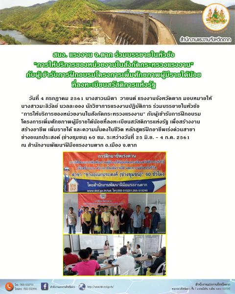 สำนักงานแรงงานจังหวัดตาก ร่วมบรรยายในหัวข้อ "การให้บริการของหน่วยงานในสังกัดกระทรวงแรงงาน" กับผู้เข้ารับการฝึกอบรมโครงการเพิ่มศักยภาพผู้มีรายได้น้อยที่ลงทะเบียนสวัสดิการแห่งรัฐ