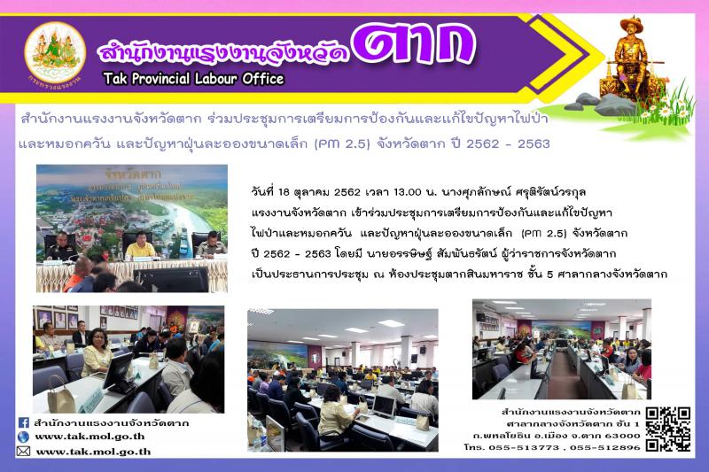 สำนักงานแรงงานจังหวัดตาก ร่วมประชุมการเตรียมการป้องกันและแก้ไขปัญหาไฟป่า และหมอกควัน และปัญหาฝุ่นละอองขนาดเล็ก (PM 2.5) จังหวัดตาก ปี 2562 – 2563 ครั้งที่ 1/2563