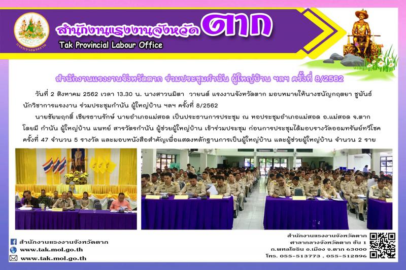 สำนักงานแรงงานจังหวัดตาก ร่วมประชุมกำนัน ผู้ใหญ่บ้าน ฯลฯ ครั้งที่ 8/2562