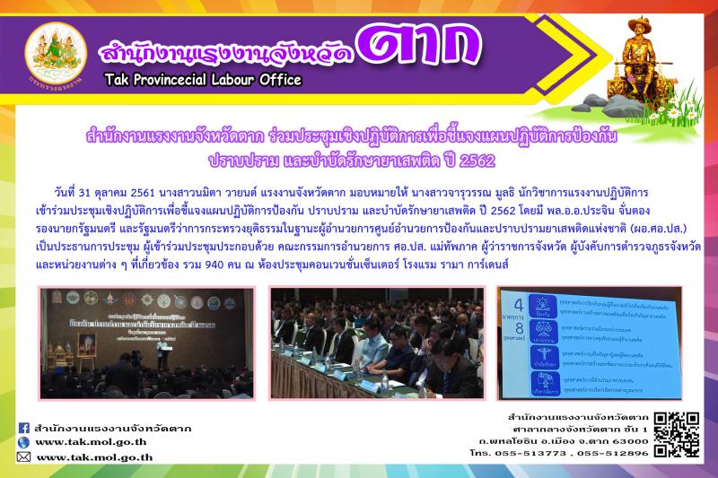 สำนักงานแรงงานจังหวัดตาก ร่วมประชุมเชิงปฏิบัติการเพื่อชี้แจงแผนปฏิบัติการป้องกัน ปราบปราม และบำบัดรักษายาเสพติด ปี 2562