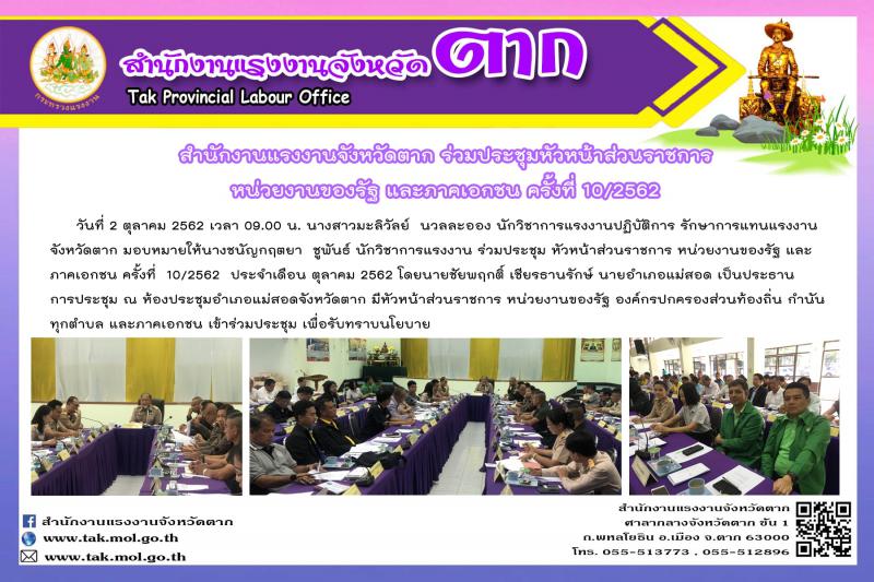สำนักงานแรงงานจังหวัดตาก ร่วมประชุม หัวหน้าส่วนราชการ หน่วยงานของรัฐ และ ภาคเอกชน ครั้งที่ 10/2562