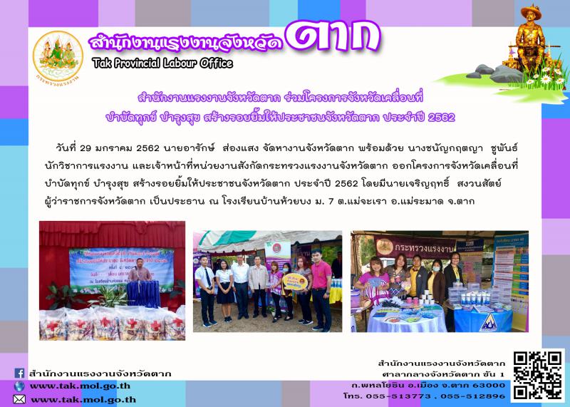 สำนักงานแรงงานจังหวัดตาก ร่วมโครงการจังหวัดเคลื่อนที่ บำบัดทุกข์ บำรุงสุข สร้างรอยยิ้มให้ประชาชนจังหวัดตาก ประจำปี 2562