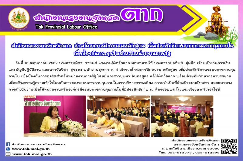 สำนักงานแรงงานจังหวัดตาก ร่วมโครงการฝึกอบรมหลักสูตร เพิ่มประสิทธิภาพระบบการควบคุมภายใน เพื่อป้องกันการทุจริตสำหรับหน่วยงานภาครัฐ