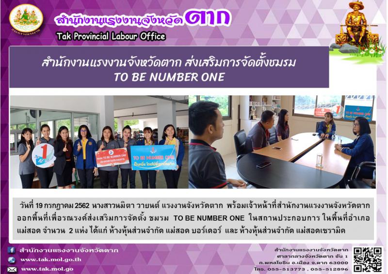สำนักงานแรงงานจังหวัดตาก ส่งเสริมการจัดตั้งชมรม TO BE NUMBER ONE ในสถานประกอบการ ในพื้นที่อำเภอแม่สอด จำนวน 2 แห่ง ได้แก่ ห้างหุ้นส่วนจำกัด แม่สอดบอร์เดอร์ และ ห้างหุ้นส่วนจำกัด แม่สอดเซรามิค