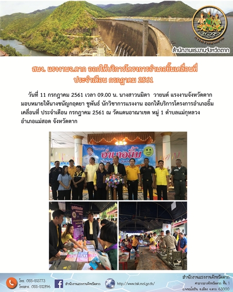 สำนักงานแรงงานจังหวัดตาก ออกให้บริการโครงการอำเภอยิ้มเคลื่อนที่ ประจำเดือน กรกฎาคม 2561