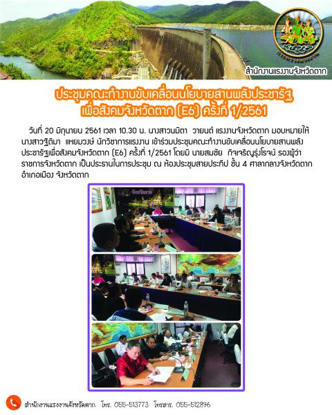 สำนักงานแรงงานจังหวัดตาก เข้าร่วมประชุมคณะทำงานขับเคลื่อนนโยบายสานพลังประชารัฐเพื่อสังคมจังหวัดตาก (E6) ครั้งที่ 1/2561