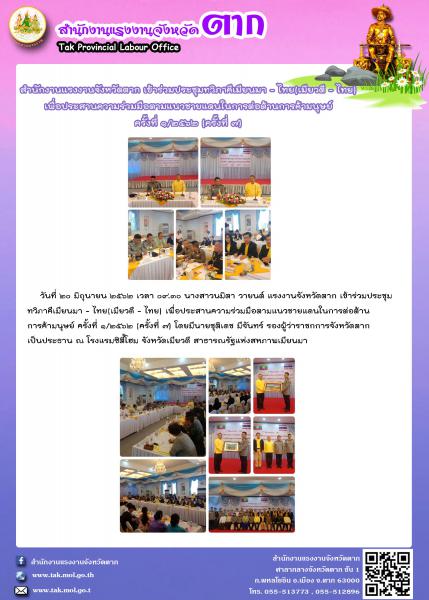 สำนักงานแรงงานจังหวัดตาก เข้าร่วมประชุมทวิภาคีเมียนมา – ไทย(เมียวดี – ไทย) เพื่อประสานความร่วมมือตามแนวชายแดนในการต่อต้านการค้ามนุษย์ ครั้งที่ ๑/๒๕๖๒ (ครั้งที่ ๗)