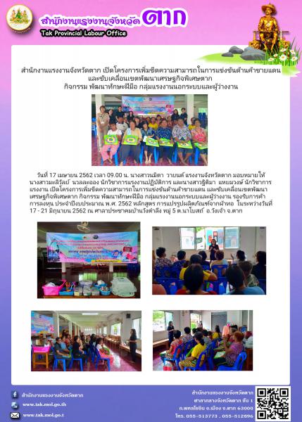 สำนักงานแรงงานจังหวัดตาก เปิดโครงการเพิ่มขีดความสามารถในการแข่งขันด้านค้าชายแดนและขับเคลื่อนเขตพัฒนาเศรษฐกิจพิเศษตาก กิจกรรม พัฒนาทักษะฝีมือ กลุ่มแรงงานนอกระบบและผู้ว่างงาน