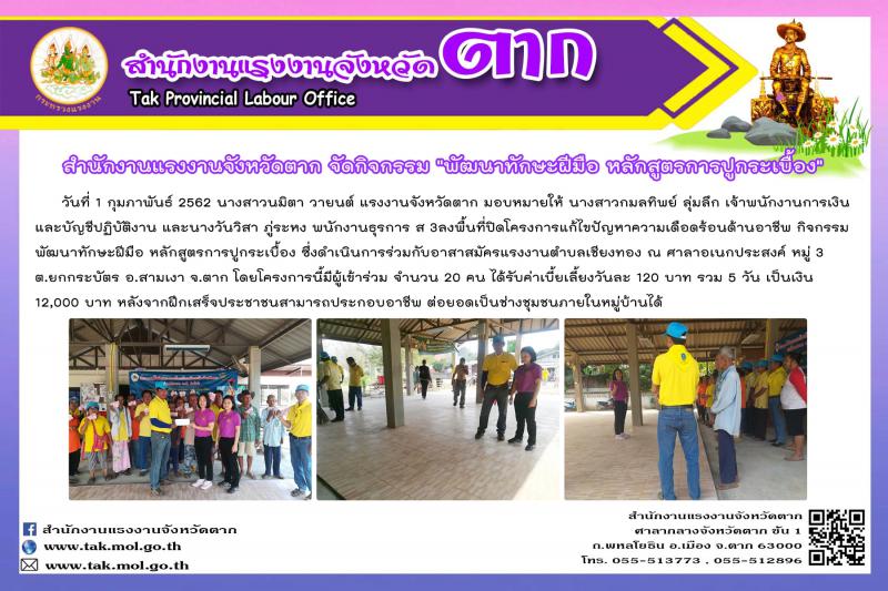 สำนักงานแรงงานจังหวัดตาก จัดกิจกรรม “พัฒนาทักษะฝีมือ หลักสูตรการปูกระเบื้อง”