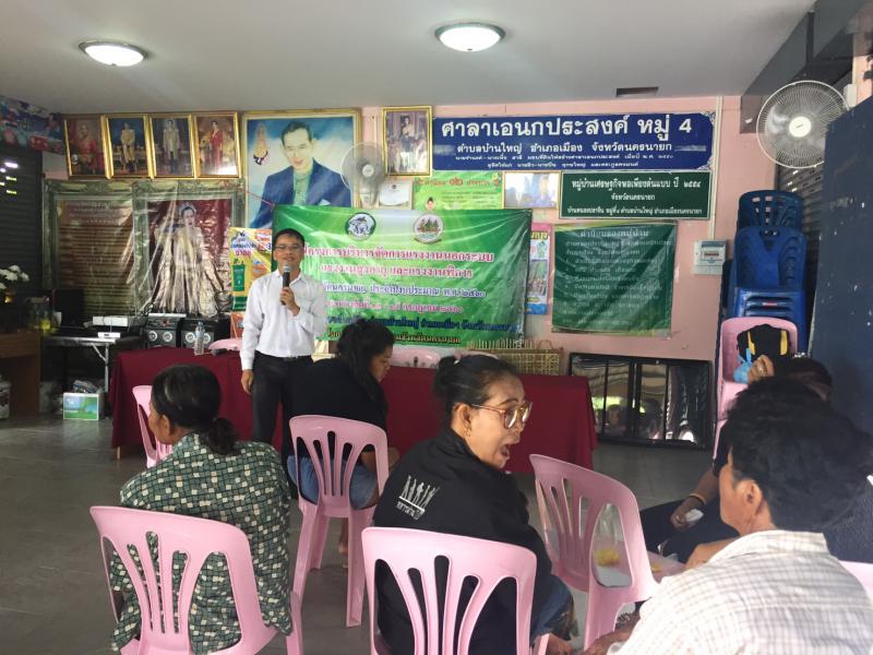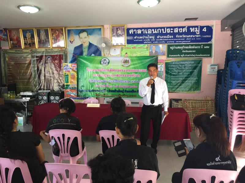 สำนักงานแรงงานจังหวัดนครนายก จัดกิจกรรมส่งเสริม คุ้มครองและพัฒนาแรงงานนอกระบบ และผู้สูงอายุ ตามโครงการบริหารจัดการแรงงานนอกระบบ แรงงานสูงอายุ แรงงานพิการ จังหวัดนครนายก ณ ศาลาอเนกประสงค์ หมู่ 4 ตำบลบ้านใหญ่ อำเภอเมืองนครนายก จังหวัดนครนายก ในระหว่างวันที่ 13- 15 กรกฎาคม 2560 โดยมีแรงงานจังหวัดนครนายก นางอำนวย คมแก้ว เป็นประธานในการจัดกิจกรรมในครั้งนี้