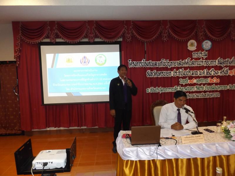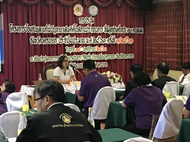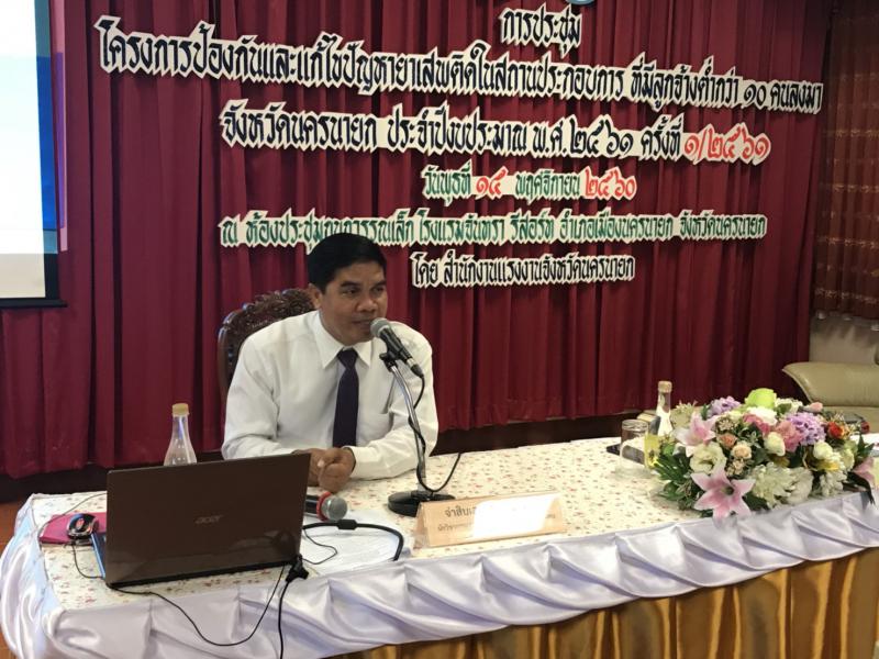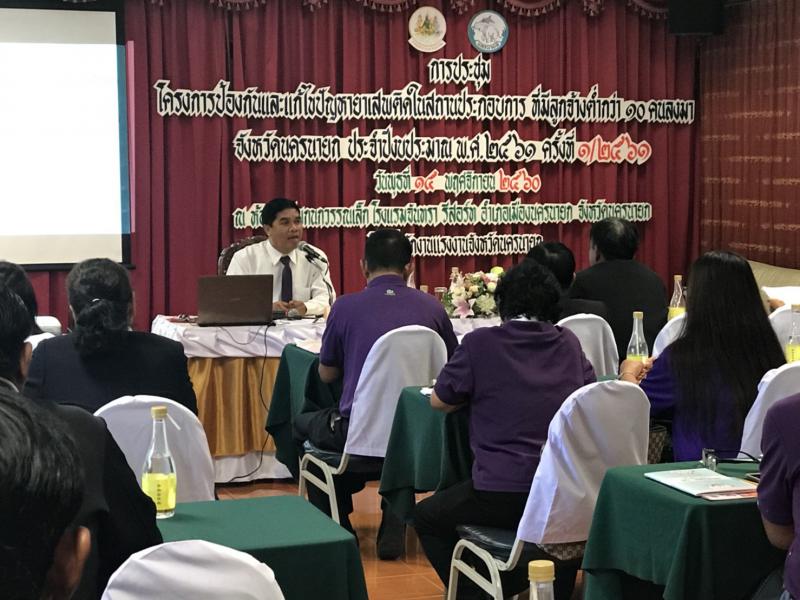 เมื่อพุธที่ 15 พฤศจิกายน 2560 จ่าสิบเอกปรีชา จันทร์ศรี นักวิชาการแรงงานชำนาญการ รักษาราชการแทน แรงงานจังหวัดนครนายก จัดประชุมตามโครงการป้องกันและแก้ไขปัญหายาเสพติดในสถานประกอบที่มีลูกจ้างต่ำกว่า 10 คนลงมา ประจำปี 2561 โดยมีวัตถุประสงค์เพื่อสร้างความรู้ความเข้าใจแก่อาสาสมัครแรงงาน ในการส่งเสริมสถานประกอบการผู้ใช้แรงงานไม่ไปยุ่งเกี่ยวกับยาเสพติด ณ ห้องประชุมกนกวรรณเล็ก โรงแรมจันทรา รีสอร์ท