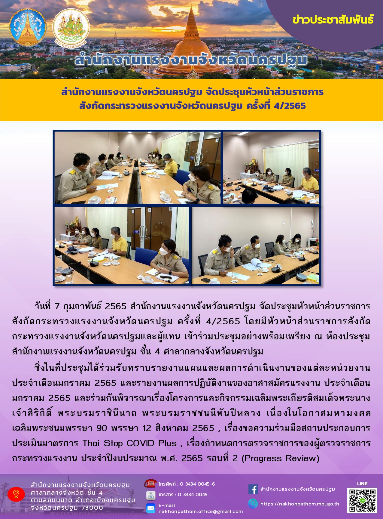 สำนักงานแรงงานจังหวัดนครปฐม จัดประชุมหัวหน้าส่วนราชการสังกัดกระทรวงแรงงานจังหวัดนครปฐม ครั้งที่ 4/2565