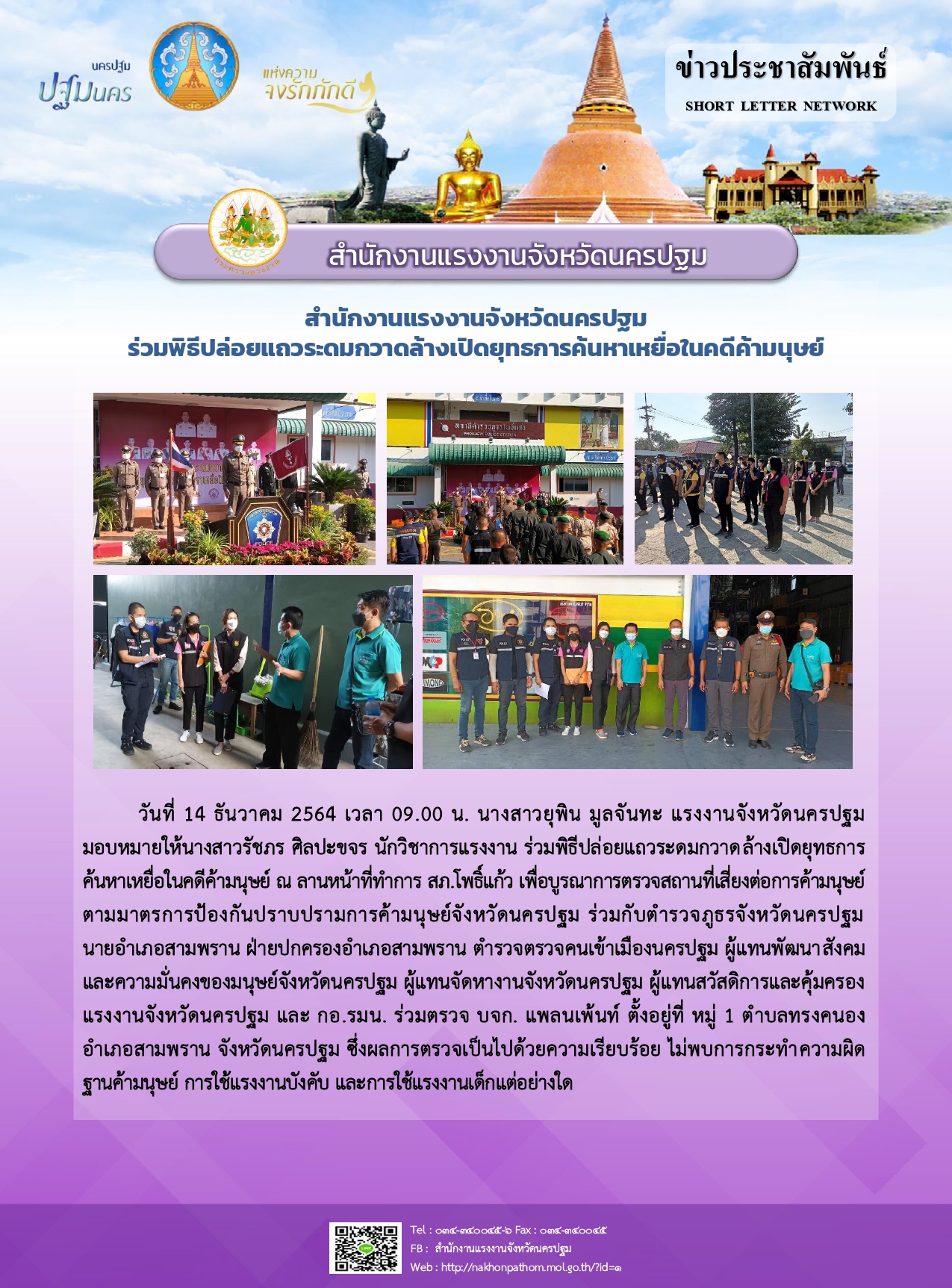 สำนักงานแรงงานจังหวัดนครปฐม ร่วมพิธีปล่อยแถวระดมกวาดล้างเปิดยุทธการค้นหาเหยื่อในคดีค้ามนุษย์