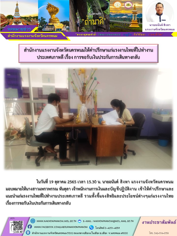 สำนักงานแรงงานจังหวัดนครพนมให้คำปรึกษาแก่แรงงานไทยที่ไปทำงานประเทศเกาหลี เรื่อง การขอรับเงินประกันการเดินทางกลับ