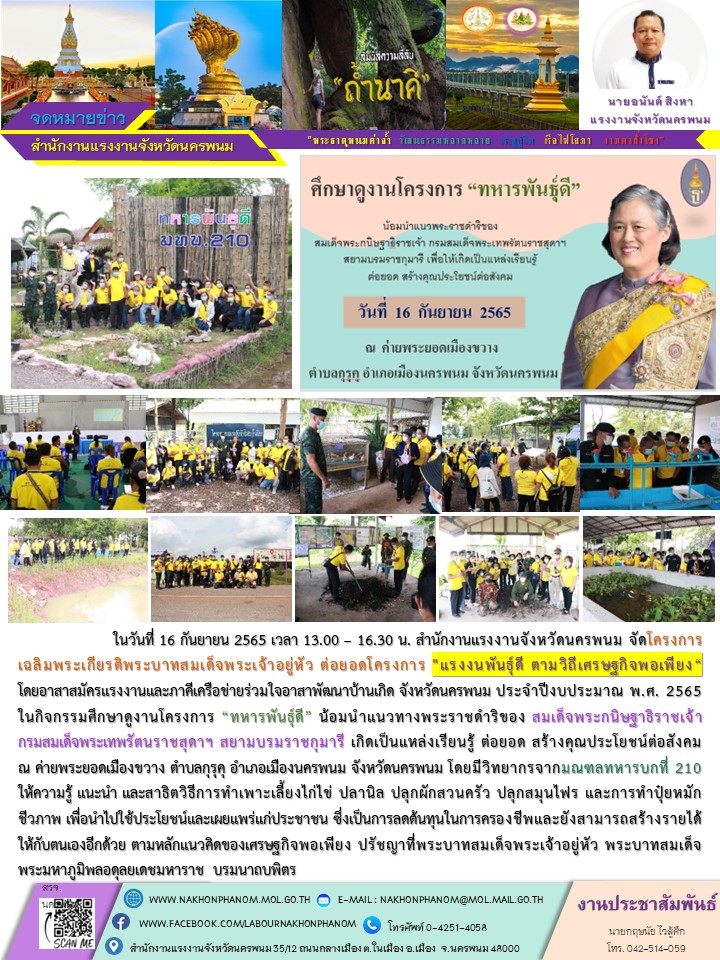 สำนักงานแรงงานจังหวัดนครพนม จัดโครงการ “แรงงนพันธุ์ดี ตามวิถีเศรษฐกิจพอเพียง” ศึกษาดูงานโครงการ “ทหารพันธุ์ดี” น้อมนำแนวทางพระราชดำริของ สมเด็จพระกนิษฐาธิราชเจ้า กรมสมเด็จพระเทพรัตนราชสุดาฯ สยามบรมราชกุมารี