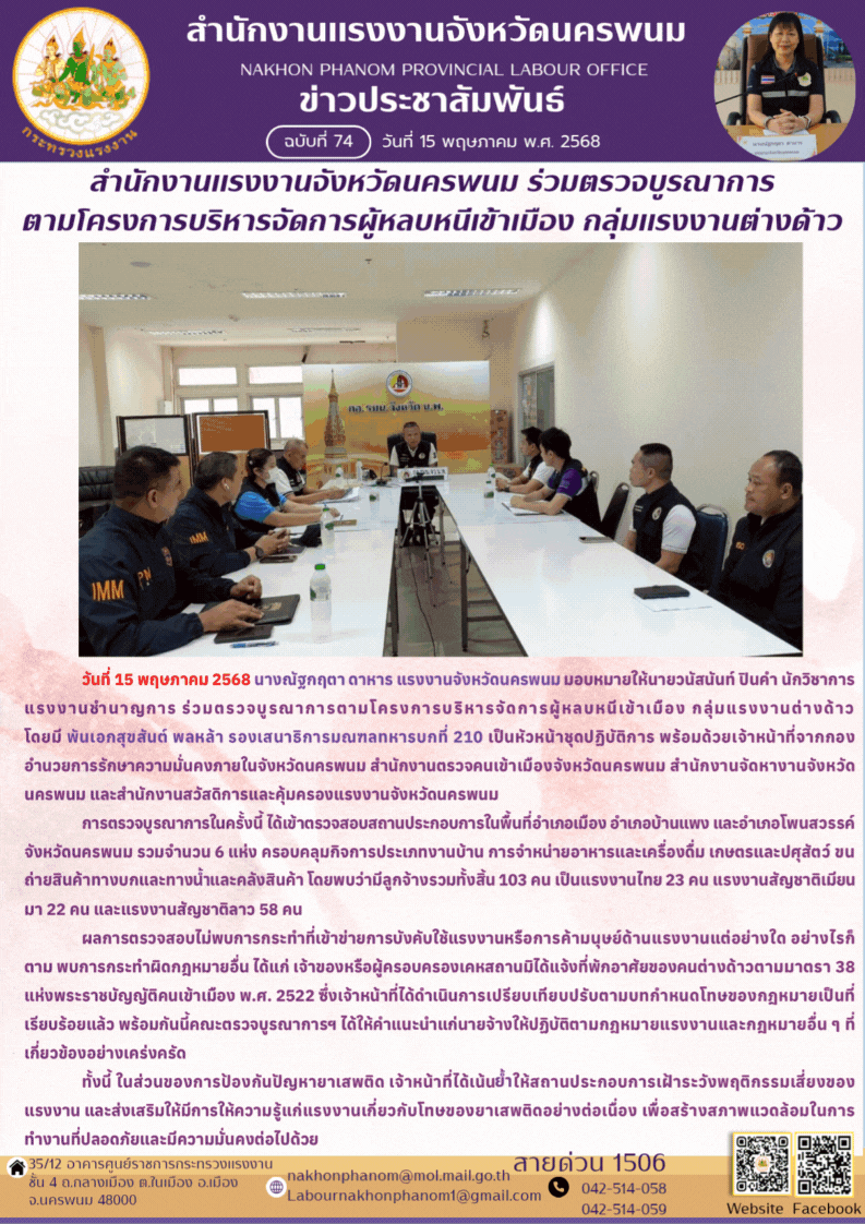 สำนักงานแรงงานจังหวัดนครพนม ร่วมตรวจบูรณาการ ตามโครงการบริหารจัดการผู้หลบหนีเข้าเมือง กลุ่มแรงงานต่างด้าว