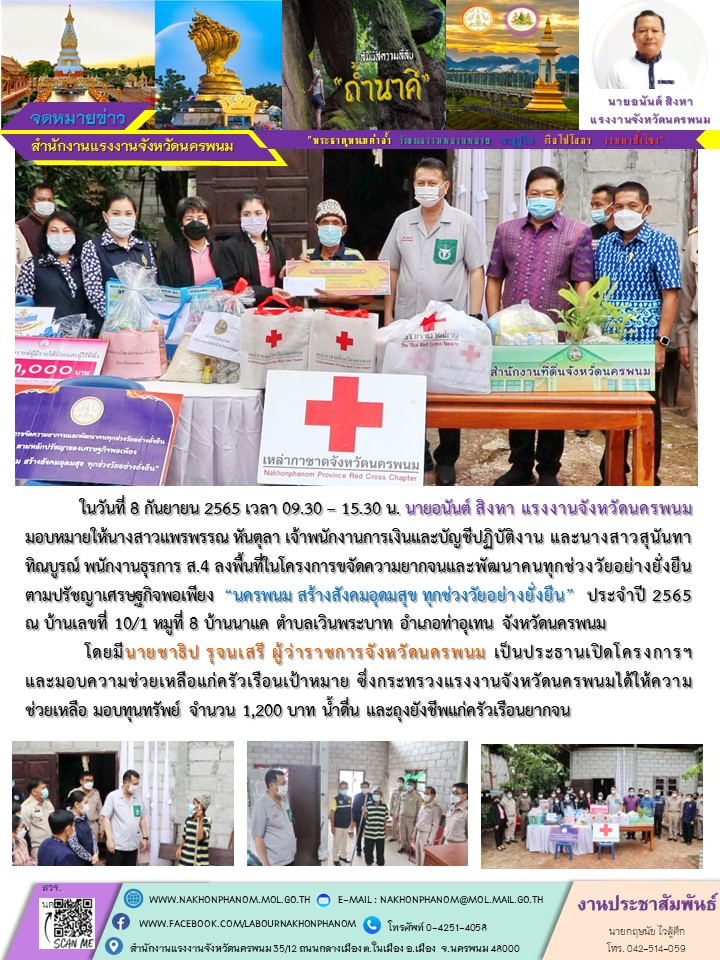 สำนักงานแรงงานจังหวัดนครพนม ลงพื้นที่อำเภอท่าอุเทน ในโครงการขจัดความยากจนและพัฒนาคนทุกช่วงวัยอย่างยั่งยืน ตามปรัชญาเศรษฐกิจพอเพียง “นครพนม สร้างสังคมอุดมสุข ทุกช่วงวัยอย่างยั่งยืน” ประจำปี 2565