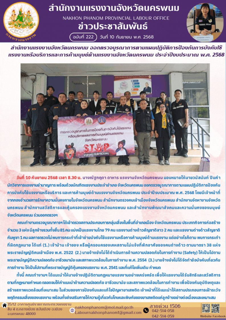 สำนักงานแรงงานจังหวัดนครพนม ออกตรวจบูรณาการตามแผนปฏิบัติการป้องกันการบังคับใช้แรงงานหรือบริการและการค้ามนุษย์ด้านแรงงานจังหวัดนครพนม ประจำปีงบประมาณ พ.ศ. 2568