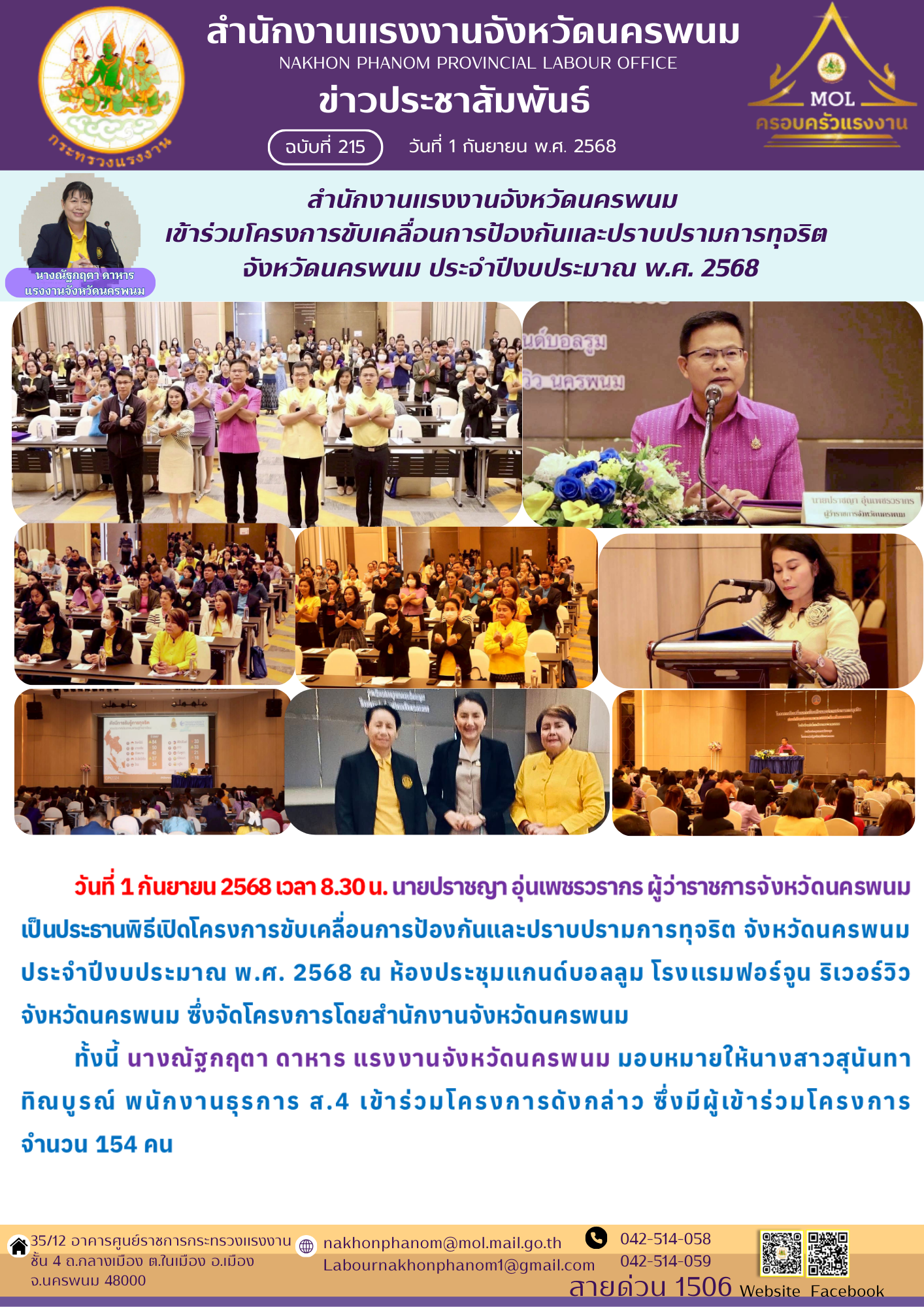 สำนักงานแรงงานจังหวัดนครพนม เข้าร่วมโครงการขับเคลื่อนการป้องกันและปราบปรามการทุจริต จังหวัดนครพนม ประจำปีงบประมาณ พ.ศ. 2568
