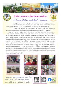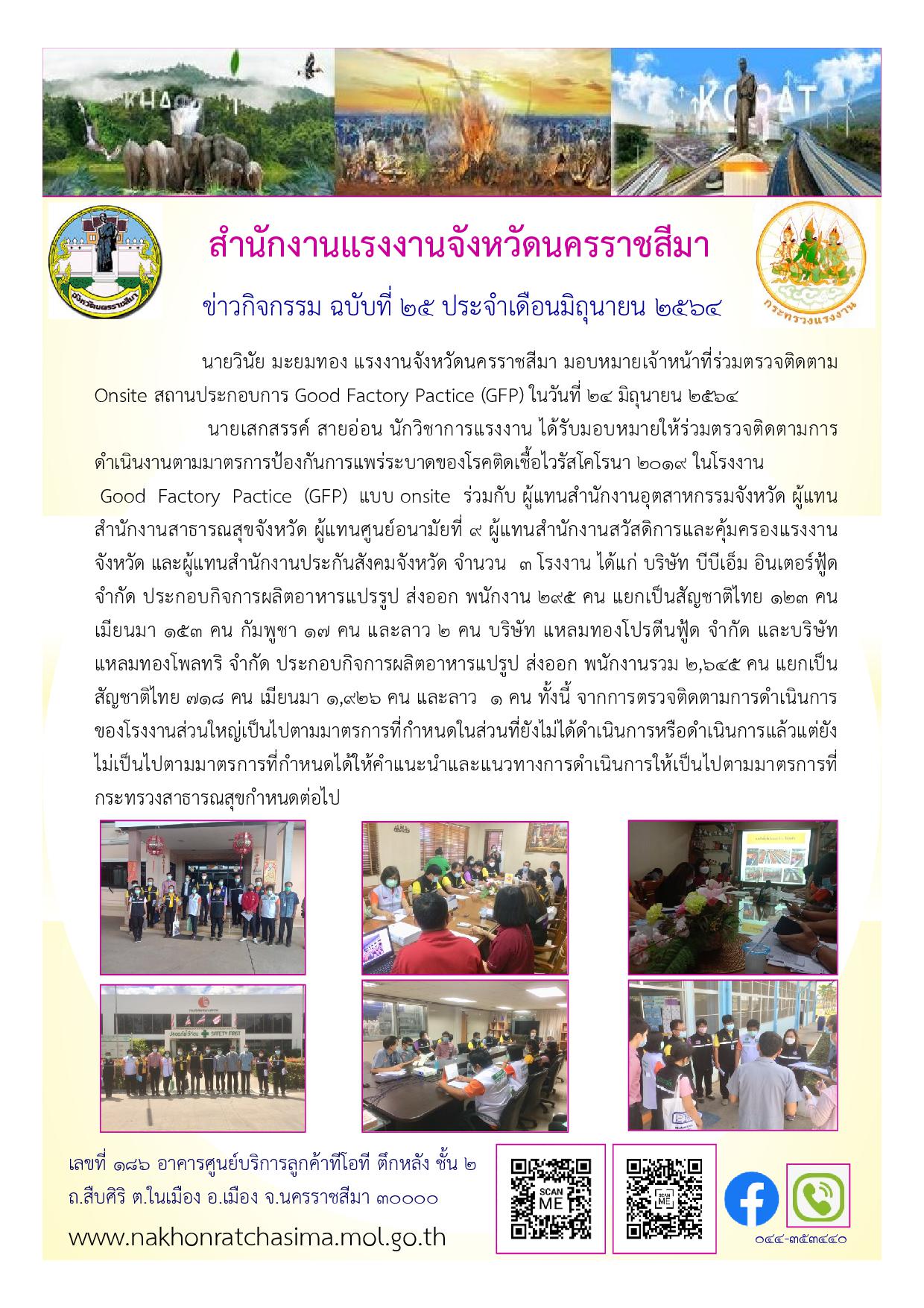 นายวินัย มะยมทอง แรงงานจังหวัดนครราชสีมา มอบหมายเจ้าหน้าที่ร่วมตรวจติดตาม Onsite สถานประกอบการ Good Factory Pactice (GFP) ในวันที่ 24 มิถุนายน 2564