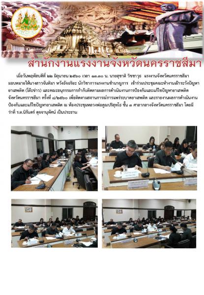 สำนักงานแรงงานจังหวัดนครราชสีมา เข้าร่วมประชุมคณะทำงานเฝ้าระวังปัญหายาเสพติด(โต๊ะข่าว) และคณะอนุกรรมการกำกับติดตามผลการดำเนินงานป้องกันและแก้ไขปัญหายาเสพติดจังหวัดนครราชสีมา ครั้งที่ 8/2560