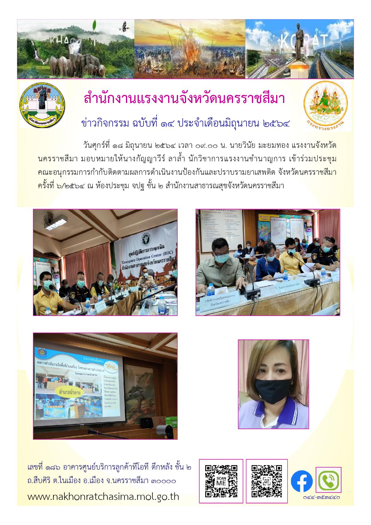 วันศุกร์ที่ 18 มิถุนายน 2564 เวลา 09.00 น. นายวินัย มะยมทอง แรงงานจังหวัดนครราชสีมา มอบหมายให้นางกัญญาวีร์ ลาล้ำ นักวิชาการแรงงานชำนาญการ เข้าร่วมประชุมคณะอนุกรรมการกำกับติดตามผลการดำเนินงานป้องกันและปราบรามยาเสพติด จังหวัดนครราชสีมา ครั้งที่ 6/2564 ณ ห้องประชุม จปฐ ชั้น 2 สำนักงานสาธารณสุขจังหวัดนครราชสีมา