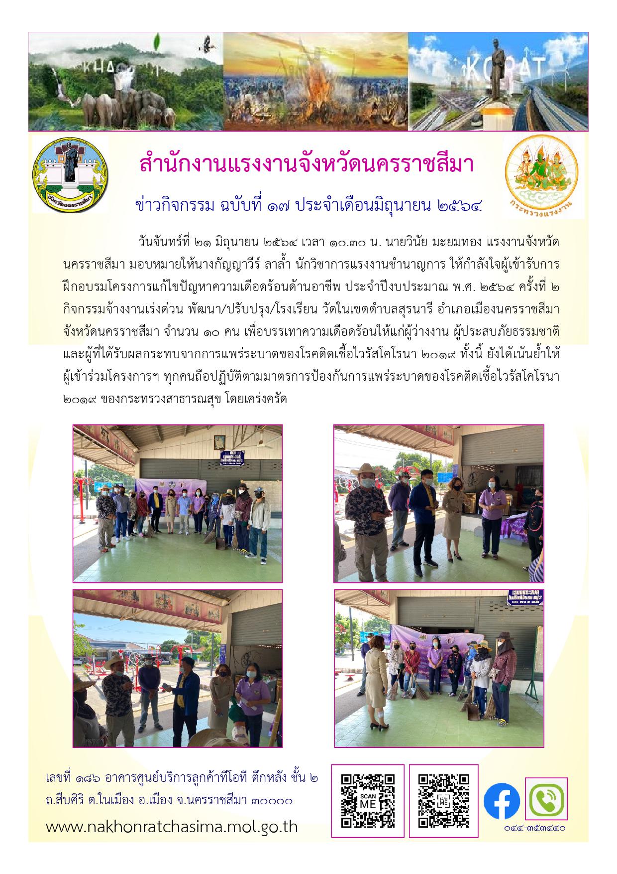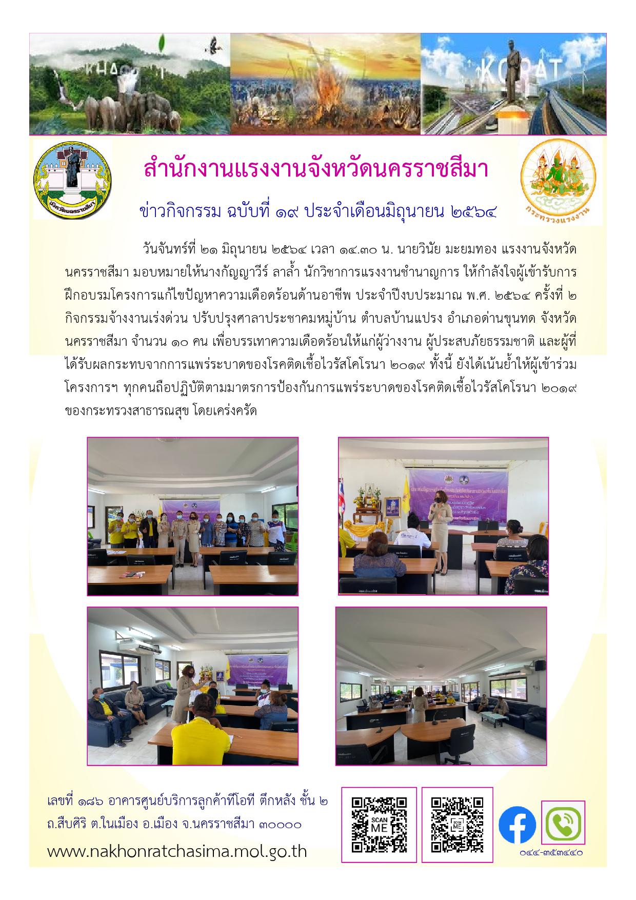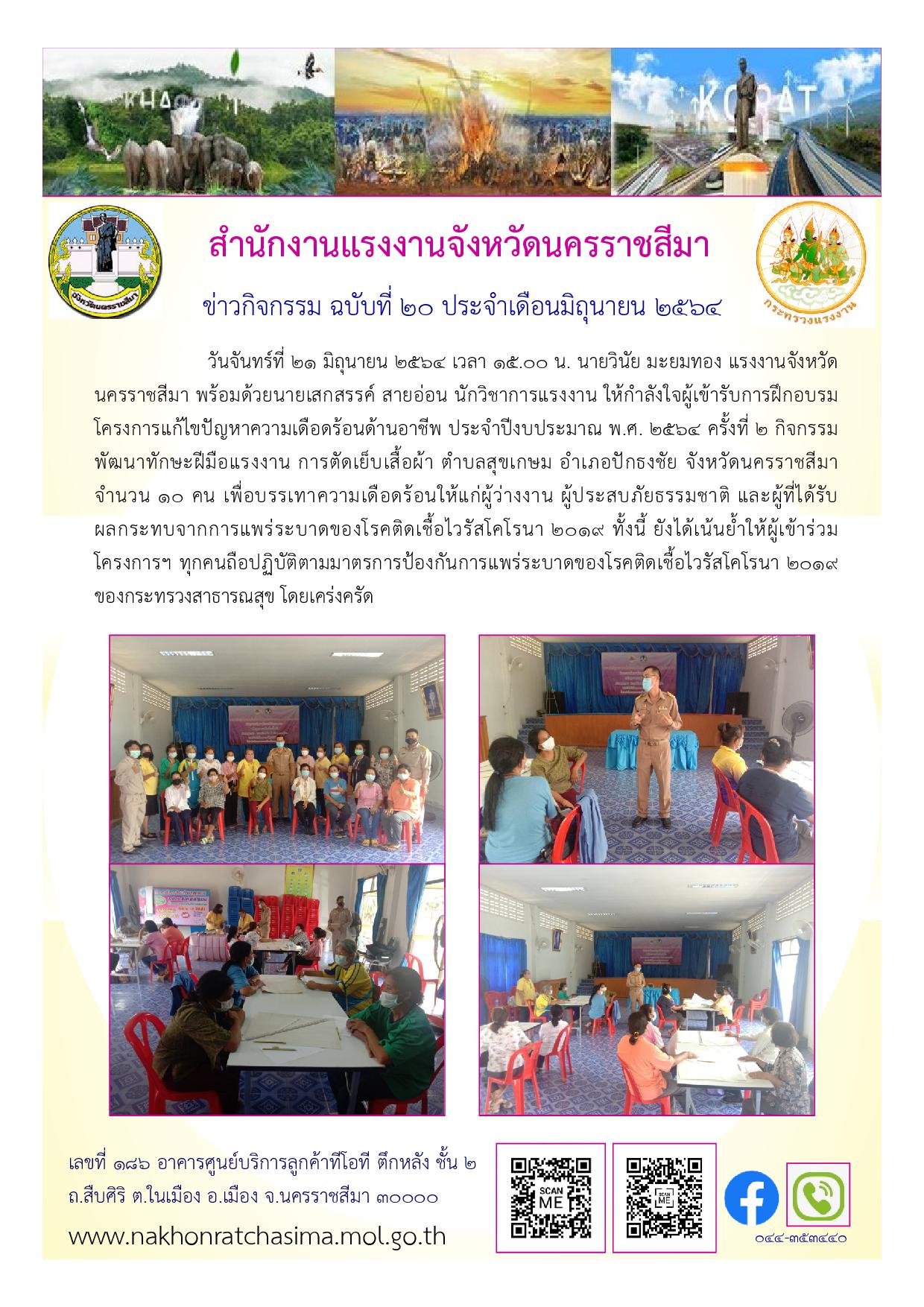 สำนักงานแรงงานจังหวัดนครราชสีมา ให้กำลังใจผู้เข้ารับการฝึกอบรมโครงการแก้ไขปัญหาความเดือดร้อนด้านอาชีพ ประจำปีงบประมาณ พ.ศ. 2564 ครั้งที่ 2 จำนวน 5 กิจกกรรม ผู้เข้าร่วมการอบรม จำนวน 62 คน เพื่อบรรเทาความเดือดร้อนให้แก่ผู้ว่างงาน ผู้ประสบภัยธรรมชาติ และผู้ที่ได้รับผลกระทบจากการแพร่ระบาดของโรคติดเชื้อไวรัสโคโรนา 2019 ทั้งนี้ ยังได้เน้นย้ำให้ผู้เข้าร่วมโครงการฯ ทุกคนถือปฏิบัติตามมาตรการป้องกันการแพร่ระบาดของโรคติดเชื้อไวรัสโคโรนา 2019 ของกระทรวงสาธารณสุข โดยเคร่งครัด