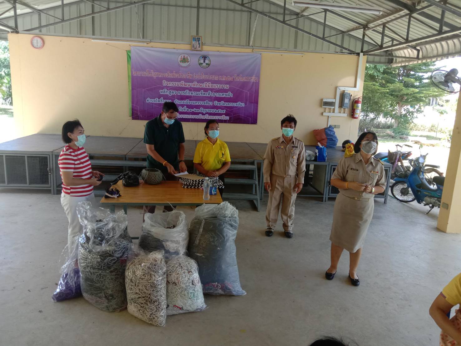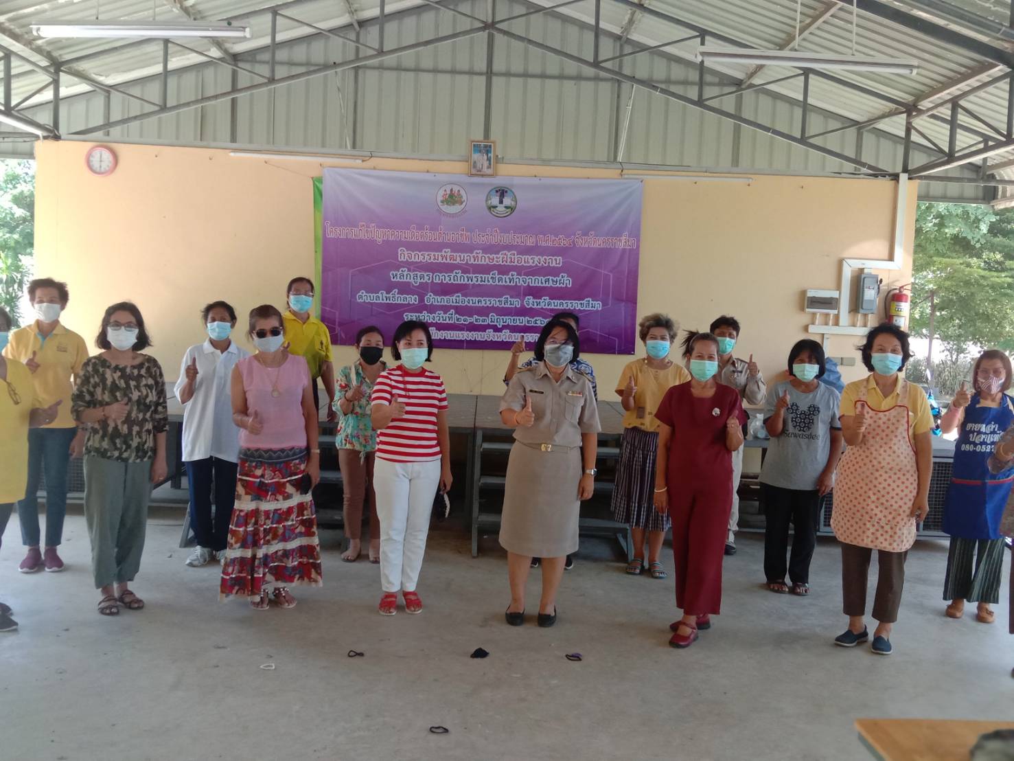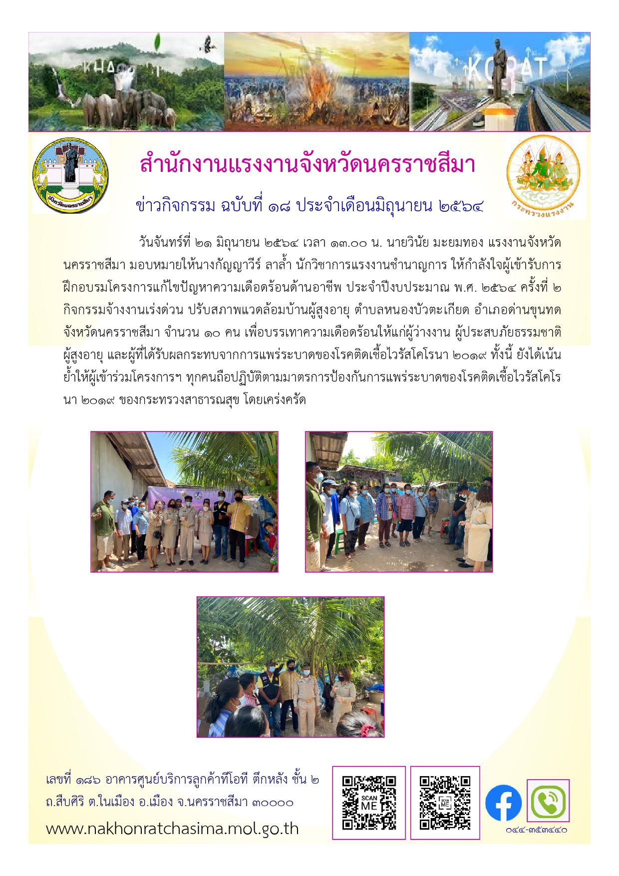 สำนักงานแรงงานจังหวัดนครราชสีมา ให้กำลังใจผู้เข้ารับการฝึกอบรมโครงการแก้ไขปัญหาความเดือดร้อนด้านอาชีพ ประจำปีงบประมาณ พ.ศ. 2564 ครั้งที่ 2 จำนวน 5 กิจกกรรม ผู้เข้าร่วมการอบรม จำนวน 62 คน เพื่อบรรเทาความเดือดร้อนให้แก่ผู้ว่างงาน ผู้ประสบภัยธรรมชาติ และผู้ที่ได้รับผลกระทบจากการแพร่ระบาดของโรคติดเชื้อไวรัสโคโรนา 2019 ทั้งนี้ ยังได้เน้นย้ำให้ผู้เข้าร่วมโครงการฯ ทุกคนถือปฏิบัติตามมาตรการป้องกันการแพร่ระบาดของโรคติดเชื้อไวรัสโคโรนา 2019 ของกระทรวงสาธารณสุข โดยเคร่งครัด