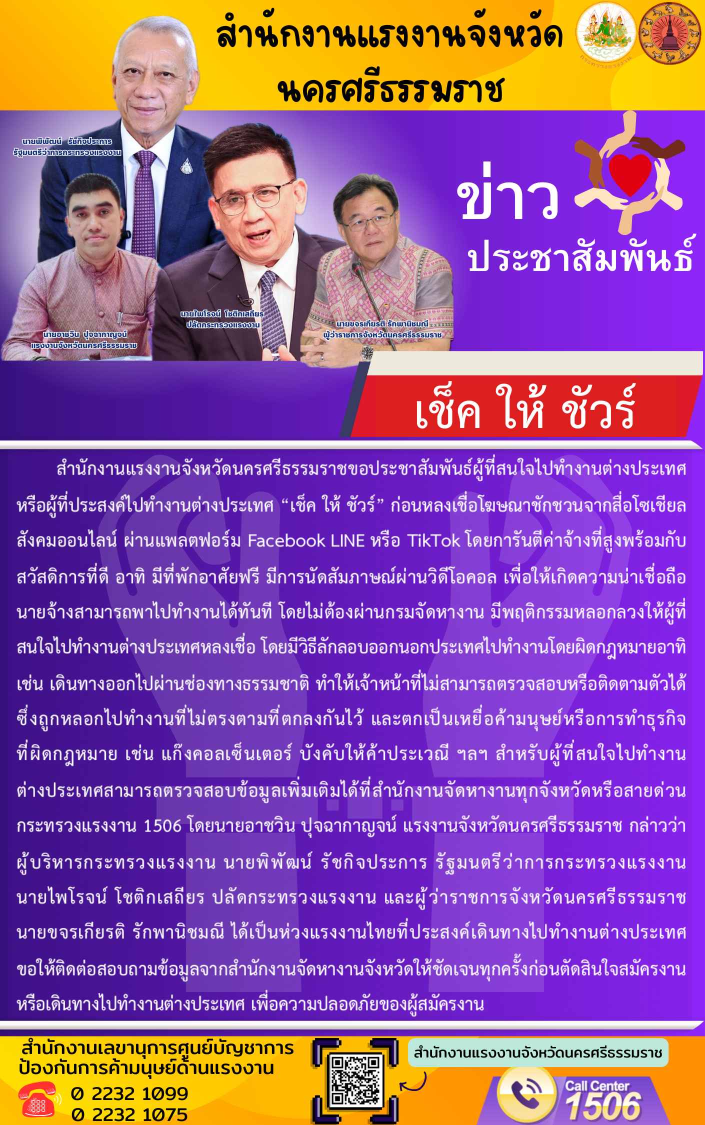 สรจ.นครศรีธรรมราช ขอประชาสัมพันธ์แรงงานไทยที่ประสงค์เดินทางไปทำงานต่างประเทศ ให้ติดต่อสอบถามข้อมูลจากสำนักงานจัดหางานจังหวัดให้ชัดเจนทุกครั้งก่อนตัดสินใจสมัครงาน หรือเดินทางไปทำงานต่างประเทศ