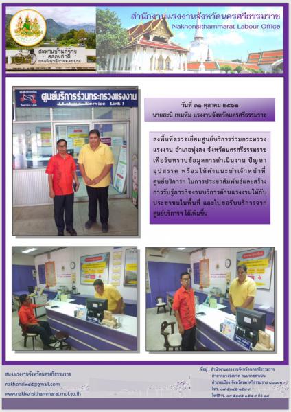 วันที่ 31 ตุลาคม 2562 นายสะนิ เหมหีม แรงงานจังหวัดนครศรีธรรมราช ลงพื้นที่ตรวจเยี่ยมศูนย์บริการร่วมกระทรวงแรงงาน อำเภอทุ่งสง จังหวัดนครศรีธรรมราช เพื่อรับทราบข้อมูลการดำเนินงาน ปัญหาอุปสรรค พร้อมให้คำแนะนำเจ้าหน้าที่ศูนย์บริการฯ ในการประชาสัมพันธ์และสร้าง การรับรู้ภารกิจงานบริการด้านแรงงานให้กับประชาชนในพื้นที่ และไปขอรับบริการจากศูนย์บริการฯ ได้เพิ่มขึ้น