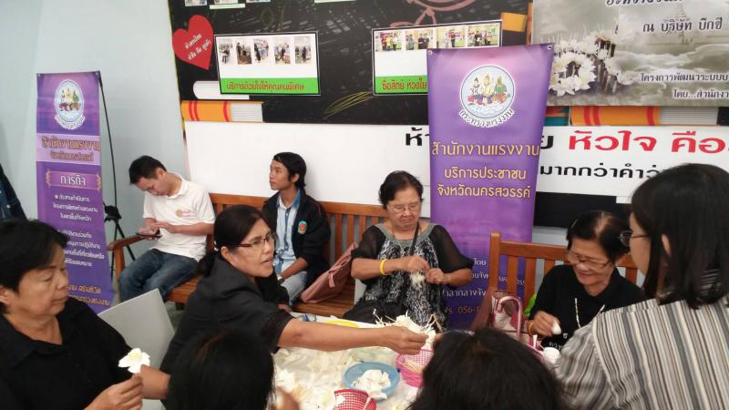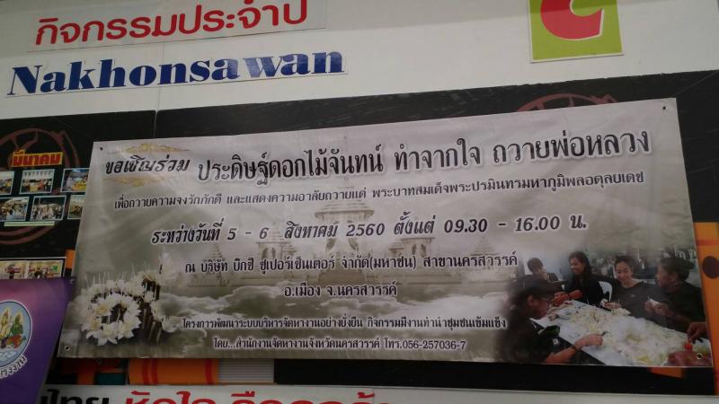 เมื่อวันที่ 5 สิงหาคม 2560 เวลา 09.30 น. สำนักงานแรงงานจังหวัดนครสวรรค์ จัดโครงการจิตอาสาประดิษฐ์ดอกไม้จันทน์พระราชทาน เพื่อให้ประชาชนมีส่วนร่วมในการถวายความจงรักภักดี และแสดงความอาลัยถวายแด่พระบาทสมเด็จพระปรมินทรมาหาภูมิพลอดุลยเดช ในระหว่างวันที่ 5–6 สิงหาคม 2560 เวลา 09.30–16.00 น. ณ บริษัท บิ๊กซี ซูเปอร์เซ็นเตอร์ จำกัด (มหาชน) สาขานครสวรรค์ อำเภอเมือง จังหวัดนครสวรรค์ และจักได้นำดอกไม้จันทน์มอบให้จังหวัดนครสวรรค์