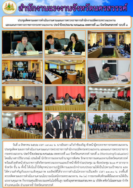 วันที่ 7 สิงหาคม 2562 เวลา 09.30 น. นางอัจฉรา แก้วกำชัยเจริญ หัวหน้าผู้ตรวจราชการกระทรวงแรงงาน ประชุมติดตามผลการดำเนินงานตามแผนการตรวจราชการสำนักงานปลัดกระทรวงแรงงาน และแผนการตรวจราชการกระทรวงแรงงาน ประจำปีงบประมาณ พ.ศ.2562 เขตตรวจที่ 18 จังหวัดนครสวรรค์ รอบที่ 3 (Monitoring/Evaluation) โดยมีนางสาววิริยาภรณ์ เปรมโพธิ์ นักวิชาการแรงงานชำนาญการพิเศษ รักษาราชการแทนแรงงานจังหวัดนครสวรรค์ พร้อมด้วยหัวหน้าส่วนราชการสังกัดกระทรวงแรงงานและเจ้าหน้าที่เข้าร่วมประชุม ณ ห้องประชุม 203 ศาลากลางจังหวัด ชั้น 2 ทั้งนี้ ได้เน้นย้ำให้ทุกหน่วยงานปฏิบัติงานและเบิกจ่ายงบประมาณให้เป็นไปตามเป้าหมาย และให้ความสำคัญกับผลงานเชิงคุณภาพ ผลลัพธ์ที่ได้จากการดำเนินโครงการเป็นหลัก เวลา 13.30 น. ลงพื้นที่ตรวจติดตามผลการดำเนินงานตามนโยบายเน้นหนักกระทรวงแรงงาน A1 (1) การยกระดับทักษะฝีมือแรงงานให้เป็นแรงงานคุณภาพ กิจกรรมศูนย์ฝึกอบรมเทคโนโลยีชั้นสูง รองรับอุตสาหกรรมแห่งอนาคต ณ บริษัท เคทิส ไบโอเอทานอล จำกัด ตำบลหนองโพ อำเภอตาคลี จังหวัดนครสวรรค์