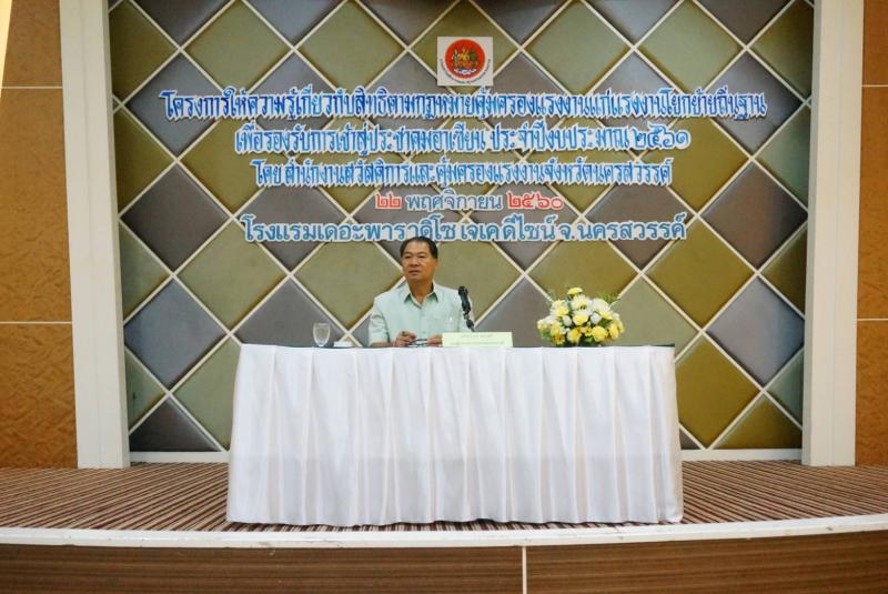 เมื่อวันพุธที่ 22 พฤศจิกายน 2560 เวลา 09.00 น. นายอภิสรรค์ สง่าศรี รองผู้ว่าราชการจังหวัดนครสวรรค์ เป็นประธานพิธีเปิดการอบรมโครงการให้ความรู้เกี่ยวกับสิทธิตามกฎหมายคุ้มครองแรงงานคุ้มครองแรงงานแก่แรงงานโยกย้ายถิ่นฐานเพื่อรองรับการเข้าสู่ประชาคมอาเซียน ประจำปีงบประมาณ 2561 ณ ห้องประชุมฟอรั่ม บอลรูม โรงแรมเดอะพาราดิโซ อำเภอเมืองฯ จังหวัดนครสวรรค์ โดยแรงงานจังหวัดนครสวรรค์ มอบหมายให้นายสุชัย ชาญวิกย์การ นักวิชาการแรงงานชำนาญการพิเศษ เข้าร่วมพิธีเปิดดังกล่าว