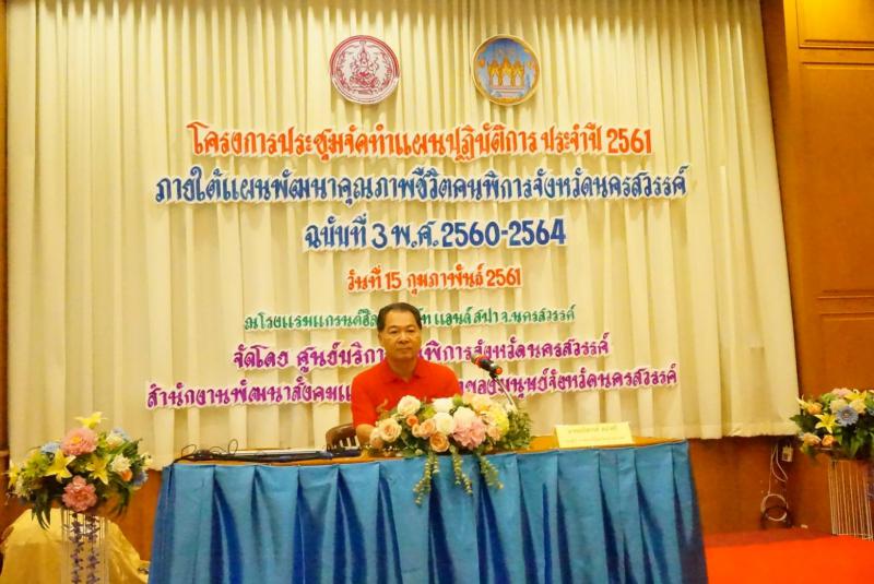 เมื่อวันพฤหัสบดีที่ 15 กุมภาพันธ์ 2561 เวลา 10.30 น. นายอภิสรรค์ สง่าศรี เป็นประธานในพิธีเปิดโครงการจัดทำแผนปฏิบัติการประจำปี 2561 ภายใต้แผนพัฒนาคุณภาพชีวิตคนพิการจังหวัดนครสวรรค์ ฉบับที่ 3 พ.ศ.2560 – 2564 ณ โรงแรมแกรนด์ฮิลล์ รีสอร์ท แอนด์ สปา อำเภอเมือง จังหวัดนครสวรรค์ ในการนี้นางพัฒนา พันธุฟัก แรงงานจังหวัดนครสวรรค์ ได้มอบหมายให้นางสาวนวรัตน์ ไชยรัตนฉัตร นักวิชาการแรงงานชำนาญการ ร่วมพิธีเปิดโครงการฯ ดังกล่าวด้วย