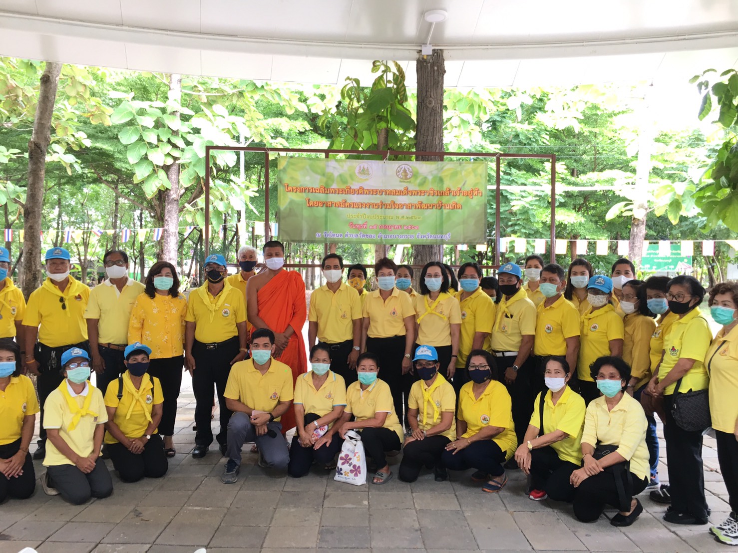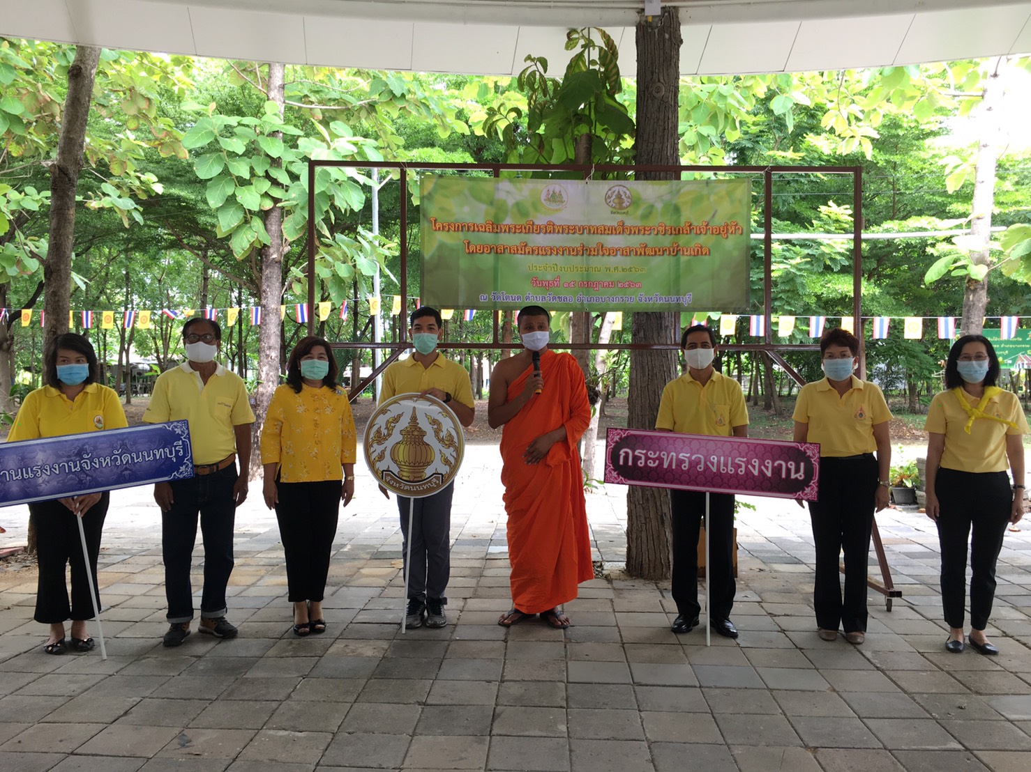 วันพุธที่ 15 กรกฎาคม 2563 นางกัญจนาภรณ์ ไซกัล แรงงานจังหวัดนนทบุรี เผยว่าสำนักงานแรงงานจังหวัดนนทบุรีจัดโครงการเฉลิมพระเกียรติพระบาทสมเด็จพระวชิรเกล้าเจ้าอยู่หัว โดยอาสาสมัครแรงงานร่วมใจอาสาพัฒนาบ้านเกิด ประจำปีงบประมาณ พ.ศ. 2563 ณ วัดโตนด ตำบลวัดชลอ อำเภอบางกรวย จังหวัดนนทบุรี ทั้งนี้มีกิจกรรมบำเพ็ญสาธารณประโยชน์ และกิจกรรมการปลูกต้นไม้เพื่อเฉลิมพระเกียรติพระบาทสมเด็จพระวชิรเกล้าเจ้าอยู่หัว รวมถึงให้ทุกคนได้ร่วมน้อมรำลึกพระมหากรุณาธิคุณของพระองค์ท่าน โดยกิจกรรมดังกล่าวมีหัวหน้าส่วนราชการในสังกัดกระทรวงแรงงานจังหวัดนนทบุรี ข้าราชการ เจ้าหน้าที่ อาสาสมัครแรงงาน และประชาชน เข้าร่วมกิจกรรมเป็นจำนวนมาก