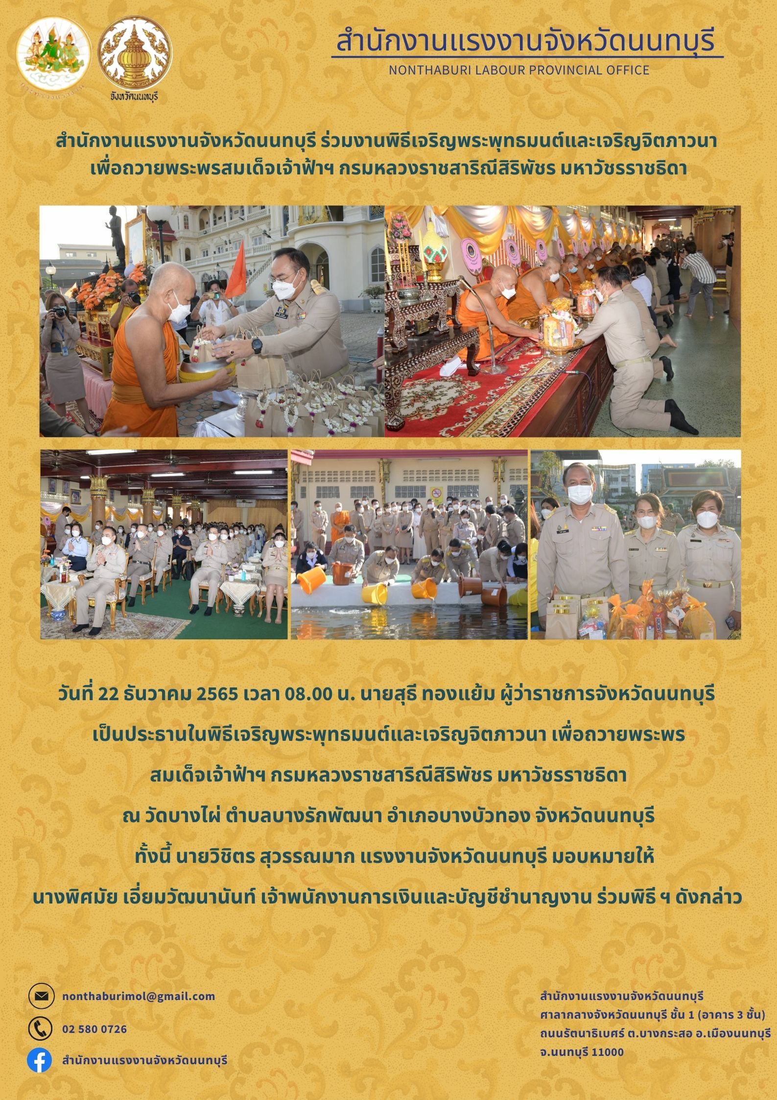 วันที่ 22 ธันวาคม 2565 เวลา 08.00 น. นายสุธี ทองแย้ม ผู้ว่าราชการจังหวัดนนทบุรี เป็นประธานในพิธีเจริญพระพุทธมนต์และเจริญจิตภาวนา เพื่อถวายพระพรสมเด็จเจ้าฟ้าฯ กรมหลวงราชสาริณีสิริพัชร มหาวัชรราชธิดา ณ วัดบางไผ่ตำบลบางรักพัฒนา อำเภอบางบัวทอง จังหวัดนนทบุรี ทั้งนี้ นายวิชิตร สุวรรณมากแรงงานจังหวัดนนทบุรี มอบหมายให้ นางพิศมัย เอี่ยมวัฒนานันท์เจ้าพนักงานการเงินและบัญชีชำนาญงาน ร่วมพิธี ฯ ดังกล่าว