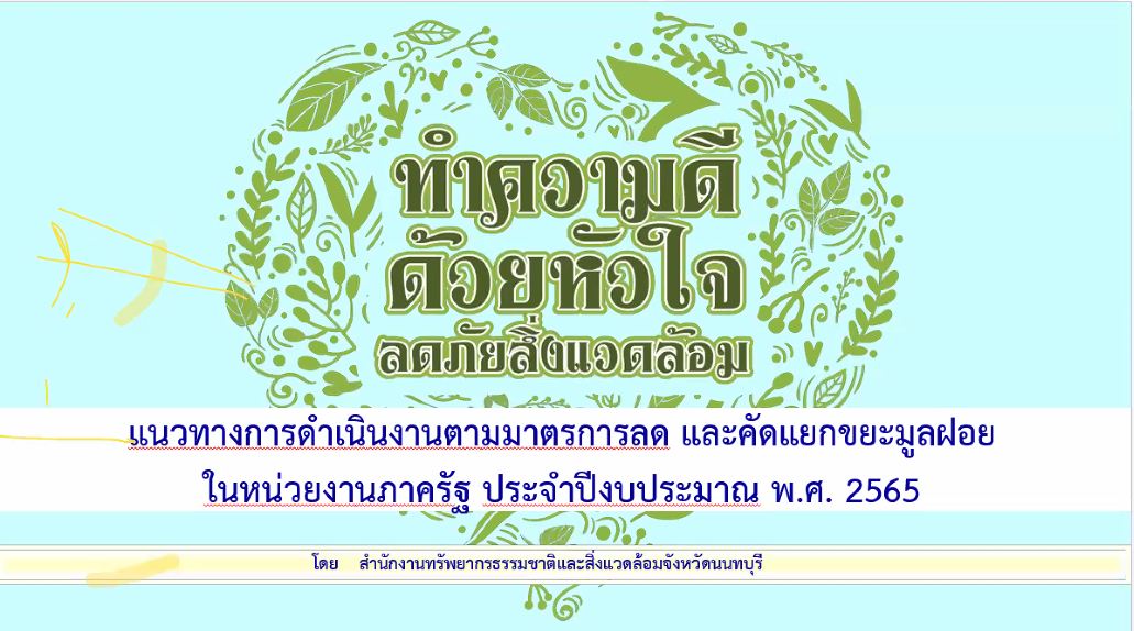 วันที่ 8 ธันวาคม 2564 นายวิชิตร สุวรรณมาก แรงงานจังหวัดนนทบุรี มอบหมายให้ นางสาววันดี นิลอร่าม นักวิชาการแรงงาน ร่วมประชุมเพื่อชี้แจงแนวทางการดำเนินงานตามมาตรการลดและคัดแยกขยะมูลฝอยในหน่วยงานภาครัฐ ประจำปีงบประมาณ 2565 โดย สำนักงานทรัพยากรธรรมชาติและสิ่งแวดล้อมจังหวัดนนทบุรี