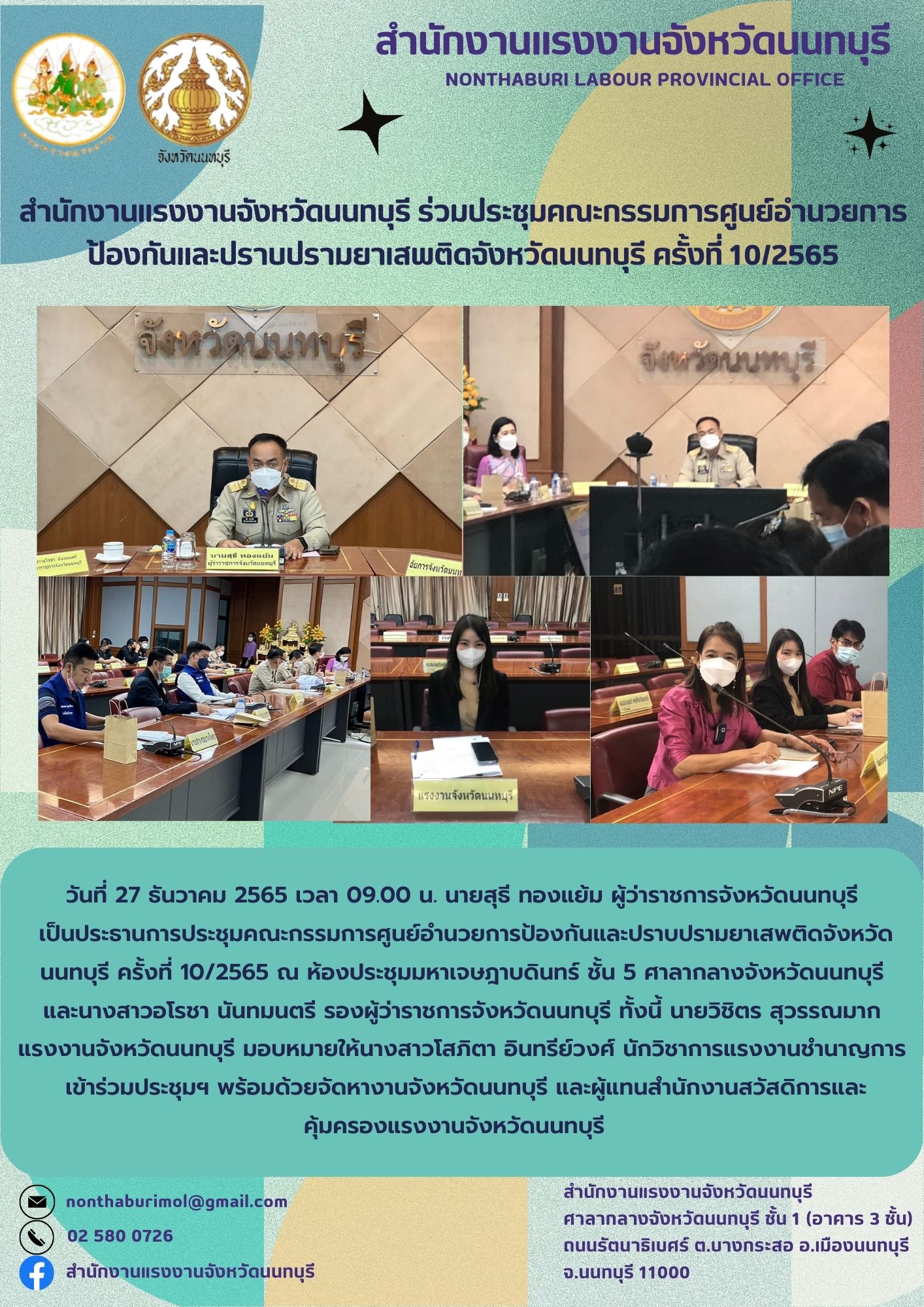 วันที่ 27 ธันวาคม 2565 เวลา 09.00 น. นายสุธี ทองแย้ม ผู้ว่าราชการจังหวัดนนทบุรี เป็นประธานการประชุมคณะกรรมการศูนย์อำนวยการป้องกันและปราบปรามยาเสพติดจังหวัดนนทบุรีครั้งที่ 10/2565 ณ ห้องประชุมมหาเจษฎาบดินทร์ ชั้น 5 ศาลากลางจังหวัดนนทบุรีและนางสาวอโรชา นันทมนตรี รองผู้ว่าราชการจังหวัดนนทบุรี ทั้งนี้ นายวิชิตร สุวรรณมากแรงงานจังหวัดนนทบุรี มอบหมายให้นางสาวโสภิตา อินทรีย์วงศ์ นักวิชาการแรงงานชำนาญการเข้าร่วมประชุมฯ พร้อมด้วยจัดหางานจังหวัดนนทบุรี และผู้แทนสำนักงานสวัสดิการและคุ้มครองแรงงานจังหวัดนนทบุรี