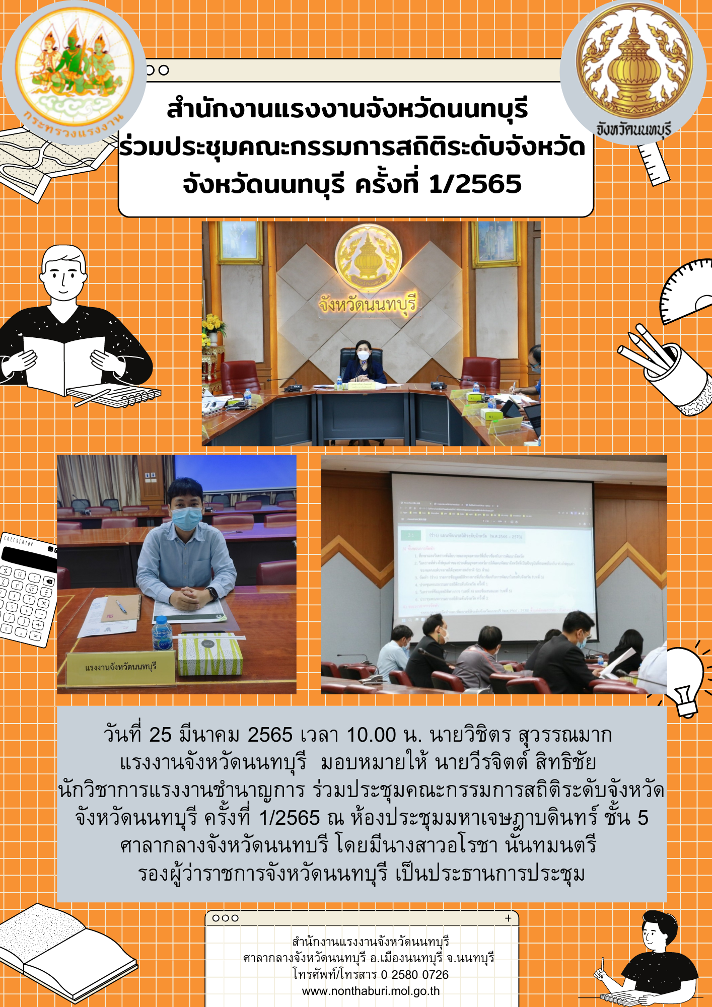 วันที่ 25 มีนาคม 2565 เวลา 10.00 น. นายวิชิตร สุวรรณมาก แรงงานจังหวัดนนทบุรี มอบหมายให้ นายวีรจิตต์ สิทธิชัย นักวิชาการแรงงานชำนาญการ ร่วมประชุมคณะกรรมการสถิติระดับจังหวัด จังหวัดนนทบุรี ครั้งที่ 1/2565 ณ ห้องประชุมมหาเจษฎาบดินทร์ ชั้น 5 ศาลากลางจังหวัดนนทบรี โดยมีนางสาวอโรชา นันทมนตรี รองผู้ว่าราชการจังหวัดนนทบุรี เป็นประธานการประชุม