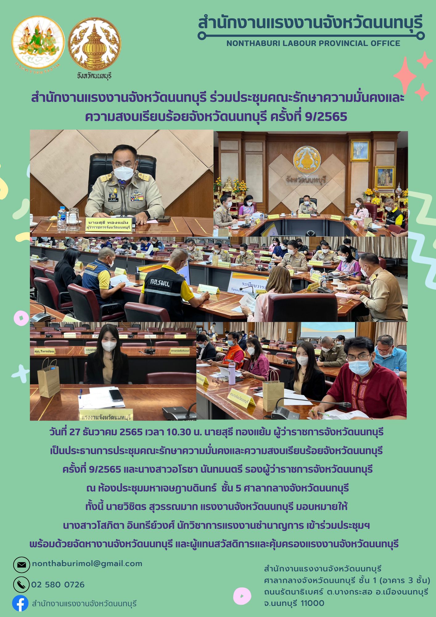 วันที่ 27 ธันวาคม 2565 เวลา 10.30 น. นายสุธี ทองแย้ม ผู้ว่าราชการจังหวัดนนทบุรี เป็นประธานการประชุมคณะรักษาความมั่นคงและความสงบเรียบร้อยจังหวัดนนทบุรีครั้งที่ 9/2565 และนางสาวอโรชา นันทมนตรี รองผู้ว่าราชการจังหวัดนนทบุรี ณ ห้องประชุมมหาเจษฎาบดินทร์ชั้น 5 ศาลากลางจังหวัดนนทบุรี ทั้งนี้ นายวิชิตร สุวรรณมาก แรงงานจังหวัดนนทบุรีมอบหมายให้ นางสาวโสภิตา อินทรีย์วงศ์ นักวิชาการแรงงานชำนาญการ เข้าร่วมประชุมฯพร้อมด้วยจัดหางานจังหวัดนนทบุรี และผู้แทนสวัสดิการและคุ้มครองแรงงานจังหวัดนนทบุรี