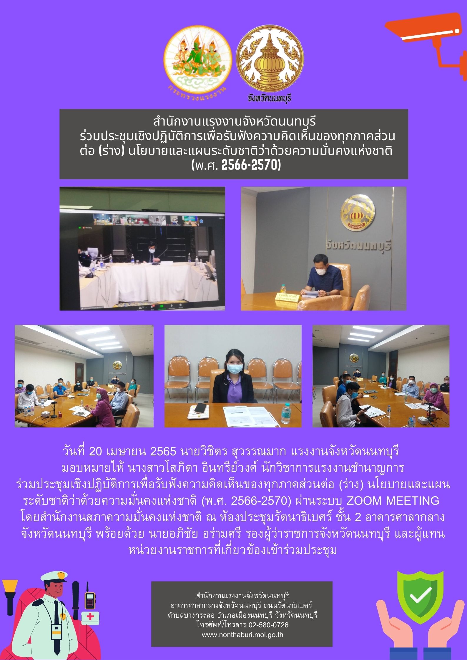 วันที่ 20 เมษายน 2565 นายวิชิตร สุวรรณมาก แรงงานจังหวัดนนทบุรี มอบหมายให้ นางสาวโสภิตา อินทรีย์วงศ์ นักวิชาการแรงงานชำนาญการ ร่วมประชุมเชิงปฏิบัติการเพื่อรับฟังความคิดเห็นของทุกภาคส่วนต่อ (ร่าง) นโยบายและแผนระดับชาติว่าด้วยความมั่นคงแห่งชาติ (พ.ศ. 2566-2570) ผ่านระบบ ZOOM MEETING โดยสำนักงานสภาความมั่นคงแห่งชาติ ณ ห้องประชุมรัตนาธิเบศร์ ชั้น 2 อาคารศาลากลางจังหวัดนนทบุรี พร้อยด้วย นายอภิชัย อร่ามศรี รองผู้ว่าราชการจังหวัดนนทบุรี และผู้แทนหน่วยงานราชการที่เกี่ยวข้องเข้าร่วมประชุม
