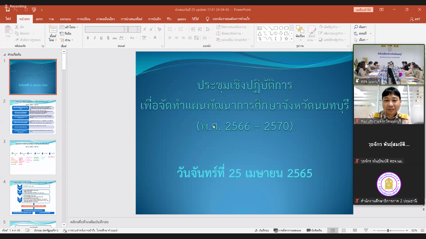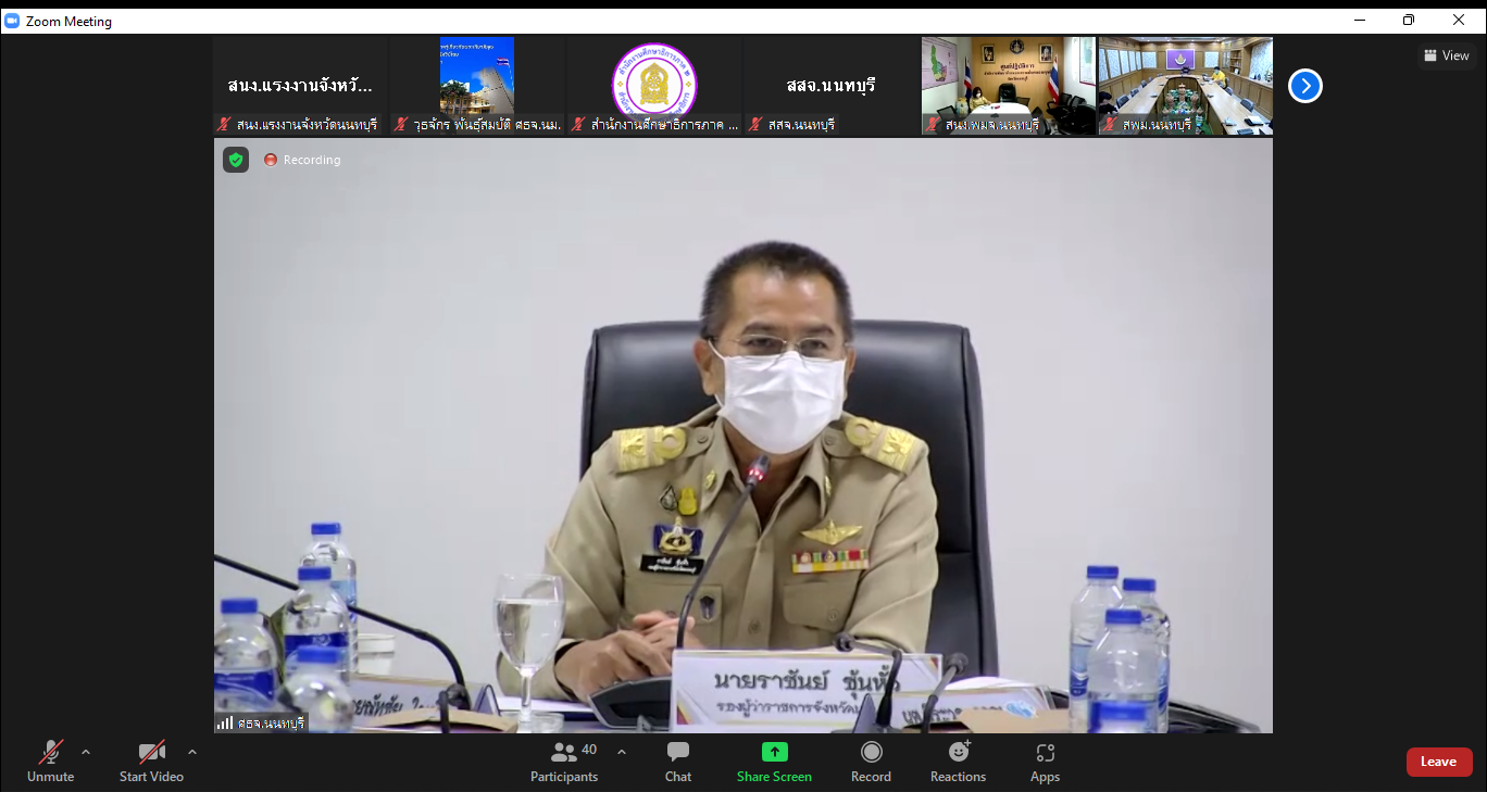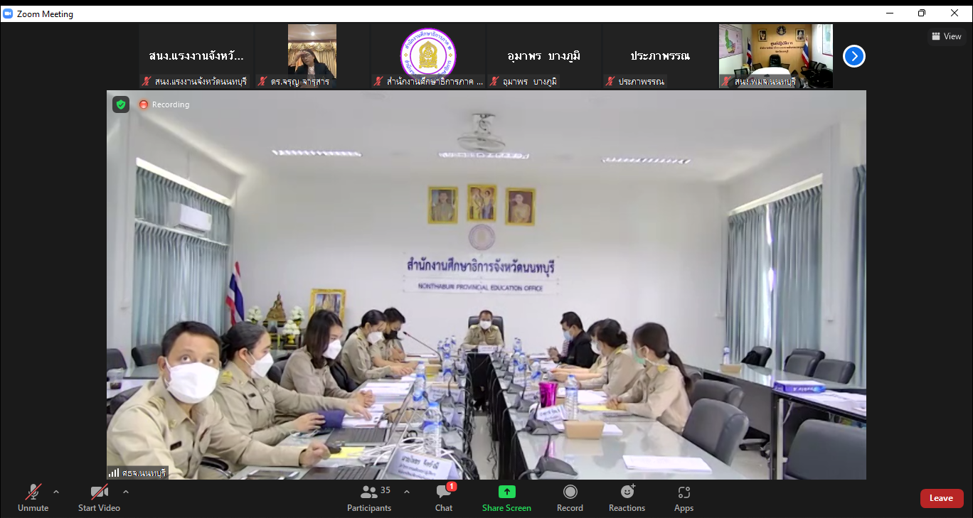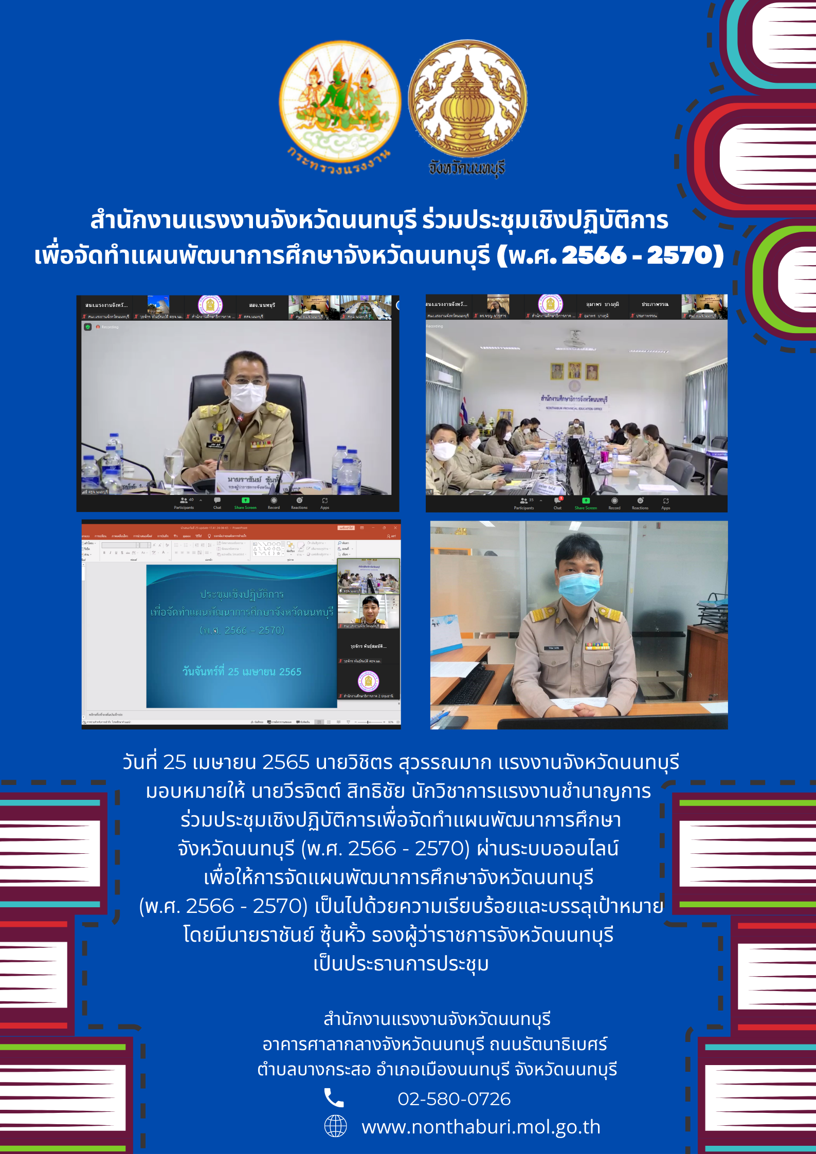 วันที่ 25 เมษายน 2565 นายวิชิตร สุวรรณมาก แรงงานจังหวัดนนทบุรี มอบหมายให้ นายวีรจิตต์ สิทธิชัย นักวิชาการแรงงานชำนาญการร่วมประชุมเชิงปฏิบัติการเพื่อจัดทำแผนพัฒนาการศึกษาจังหวัดนนทบุรี (พ.ศ. 2566 – 2570) ผ่านระบบออนไลน์ เพื่อให้การจัดแผนพัฒนาการศึกษาจังหวัดนนทบุรี(พ.ศ. 2566 – 2570) เป็นไปด้วยความเรียบร้อยและบรรลุเป้าหมาย โดยมีนายราชันย์ ซุ้นหั้ว รองผู้ว่าราชการจังหวัดนนทบุรี เป็นประธานการประชุม