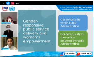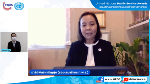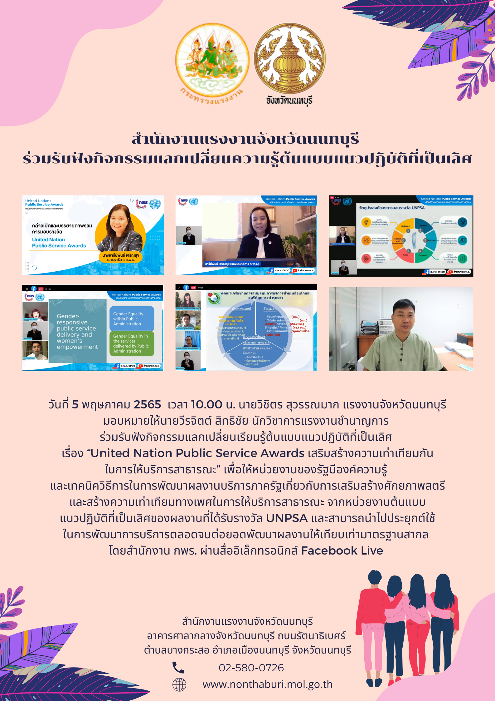 วันที่ 5 พฤษภาคม 2565 เวลา 10.00 น. นายวิชิตร สุวรรณมาก แรงงานจังหวัดนนทบุรี มอบหมายให้นายวีรจิตต์ สิทธิชัย นักวิชาการแรงงานชำนาญการ ร่วมรับฟังกิจกรรมแลกเปลี่ยนเรียนรู้ต้นแบบแนวปฏิบัติที่เป็นเลิศ เรื่อง “United Nation Public Service Awards เสริมสร้างความเท่าเทียมกัน ในการให้บริการสาธารณะ” เพื่อให้หน่วยงานของรัฐมีองค์ความรู้และเทคนิควิธีการในการพัฒนาผลงานบริการภาครัฐเกี่ยวกับการเสริมสร้างศักยภาพสตรีและสร้างความเท่าเทียมทางเพศในการให้บริการสาธารณะ จากหน่วยงานต้นแบบแนวปฏิบัติที่เป็นเลิศของผลงานที่ได้รับรางวัล UNPSA และสามารถนำไปประยุกต์ใช้ในการพัฒนาการบริการตลอดจนต่อยอดพัฒนาผลงานให้เทียบเท่ามาตรฐานสากล โดยสำนักงาน กพร. ผ่านสื่ออิเล็กทรอนิกส์ Facebook Live