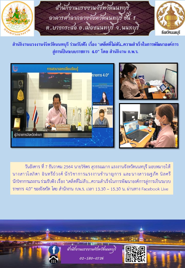 วันอังคาร ที่ 7 ธันวาคม 2564 นายวิชิตร สุวรรณมาก แรงงานจังหวัดนนทบุรี มอบหมายให้ นางสาวโสภิตา อินทรีย์วงศ์ นักวิชาการแรงงานชำนาญการ และนางสาวณฐภัค นิลศรี นักวิชาการแรงงาน ร่วมรับฟัง เรื่อง “เคล็ดที่ไม่ลับ…ความสำเร็จในการพัฒนาองค์การสู่การเป็นระบบราชการ 4.0” ของจังหวัด โดย สำนักงาน ก.พ.ร. เวลา 13.30 – 15.30 น. ผ่านทาง Facebook Live