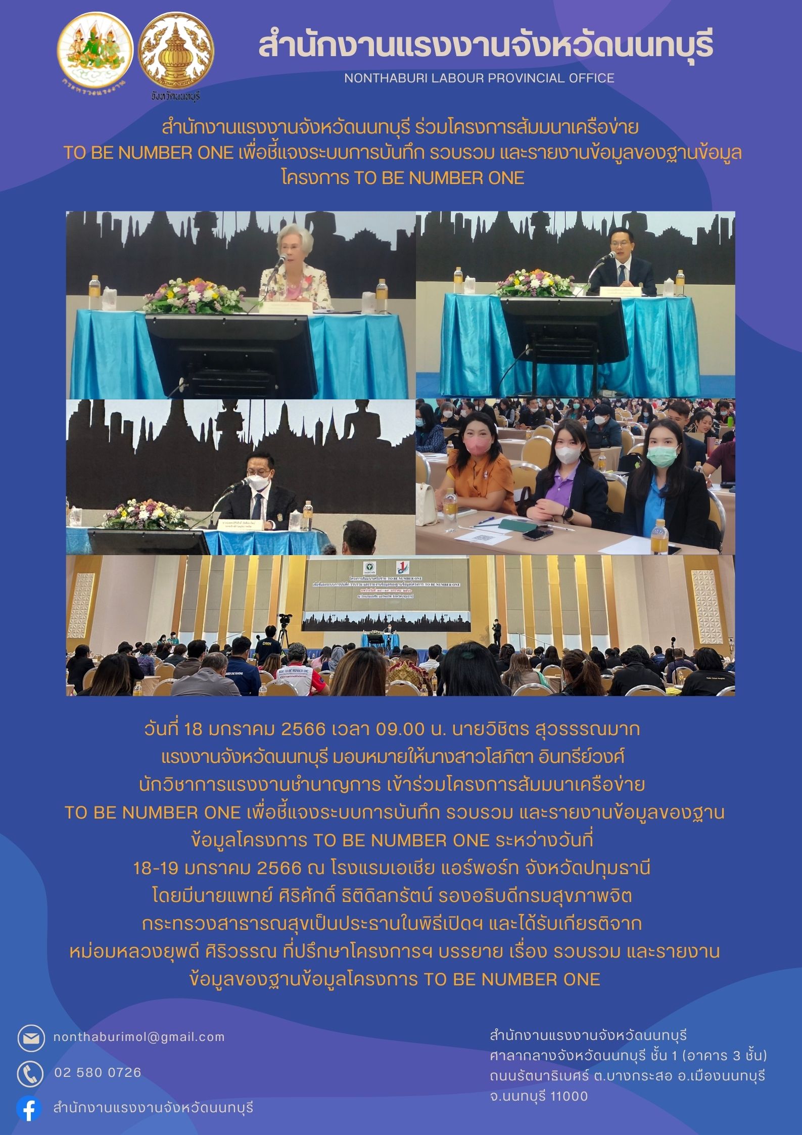 วันที่ 18 มกราคม 2566 เวลา 09.00 น. นายวิชิตร สุวรรรณมาก แรงงานจังหวัดนนทบุรี มอบหมายให้นางสาวโสภิตา อินทรีย์วงศ์ นักวิชาการแรงงานชำนาญการ เข้าร่วมโครงการสัมมนาเครือข่าย TO BE NUMBER ONE เพื่อชี้แจงระบบการบันทึก รวบรวม และรายงานข้อมูลของฐานข้อมูลโครงการ TO BE NUMBER ONE ระหว่างวันที่ 18-19 มกราคม 2566 ณ โรงแรมเอเชีย แอร์พอร์ท จังหวัดปทุมธานี โดยมีนายแพทย์ ศิริศักดิ์ ธิติดิลกรัตน์ รองอธิบดีกรมสุขภาพจิต กระทรวงสาธารณสุขเป็นประธานในพิธีเปิดฯ และได้รับเกียรติจาก หม่อมหลวงยุพดี ศิริวรรณ ที่ปรึกษาโครงการฯ บรรยาย เรื่อง รวบรวม และรายงานข้อมูลของฐานข้อมูลโครงการ TO BE NUMBER ONE