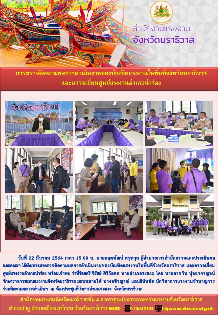 สำนักงานแรงงานจังหวัดนราธิวาส การตรวจติดตามผลการดำเนินงานของบัณฑิตแรงงานในพื้นที่จังหวัดนราธิวาส และตรวจเยี่ยมศูนย์แรงงานอำเภอนำร่อง