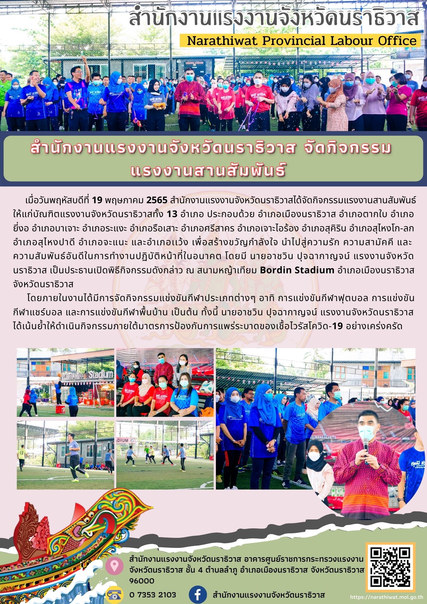 เมื่อวันพฤหัสบดีที่ 19 พฤษภาคม 2565 สำนักงานแรงงานจังหวัดนราธิวาสได้จัดกิจกรรมแรงงานสานสัมพันธ์ให้แก่บัณฑิตแรงงานจังหวัดนราธิวาสทั้ง 13 อำเภอ ประกอบด้วย อำเภอเมืองนราธิวาส อำเภอตากใบ อำเภอยี่งอ อำเภอบาเจาะ อำเภอระแงะ อำเภอรือเสาะ อำเภอศรีสาคร อำเภอเจาะไอร้อง อำเภอสุคิริน อำเภอสุไหงโก-ลก อำเภอสุไหงปาดี อำเภอจะแนะ และอำเภอเเว้ง เพื่อสร้างขวัญกำลังใจ นำไปสู่ความรัก ความสามัคคี และความสัมพันธ์อันดีในการทำงานปฏิบัติหน้าที่ในอนาคต โดยมี นายอาชวิน ปุจฉากาญจน์ แรงงานจังหวัดนราธิวาส เป็นประธานเปิดพิธีกิจกรรมดังกล่าว ณ สนามหญ้าเทียม Bordin Stadium อำเภอเมืองนราธิวาส จังหวัดนราธิวาส