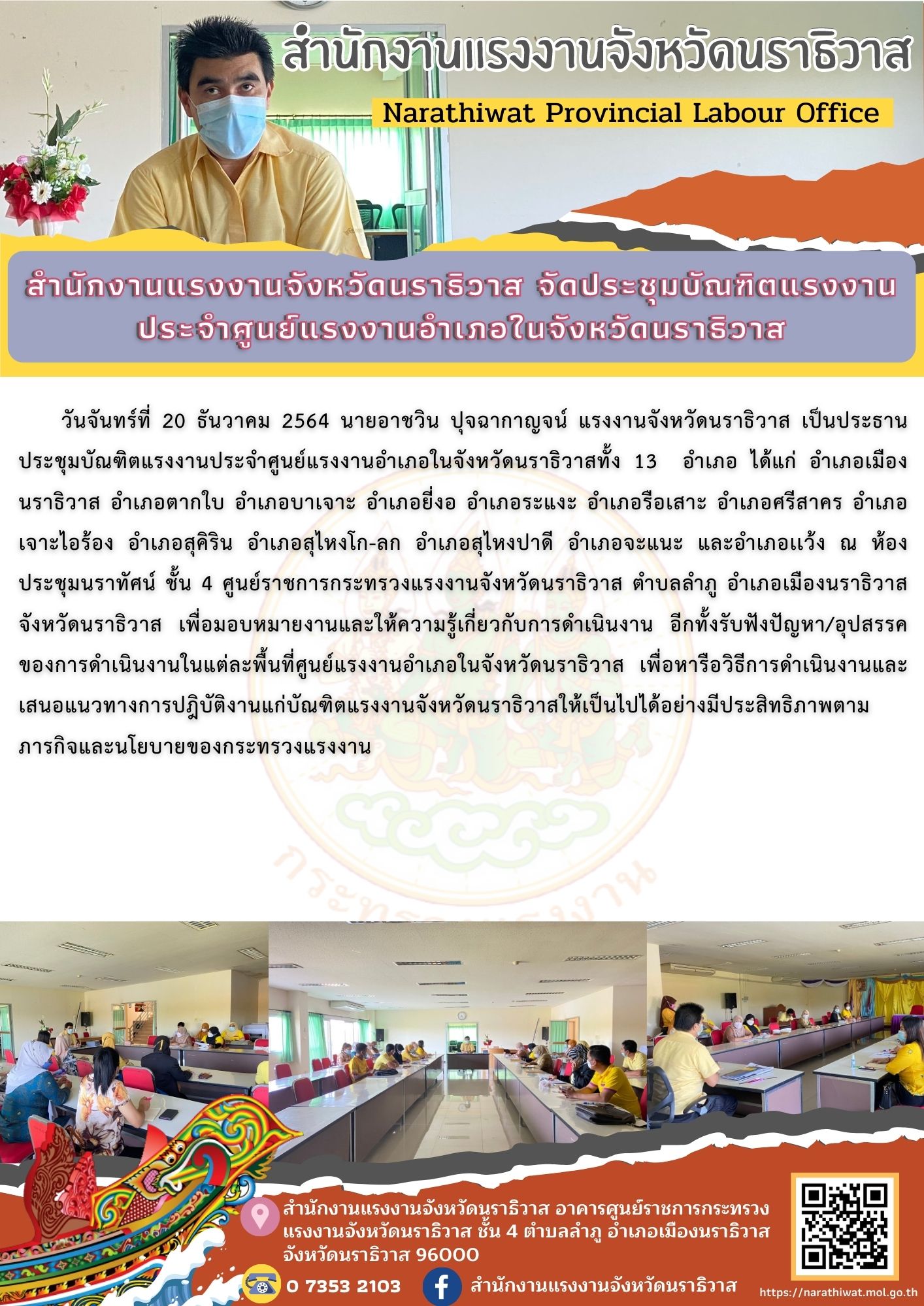 วันจันทร์ที่ 20 ธันวาคม 2564 นายอาชวิน ปุจฉากาญจน์ แรงงานจังหวัดนราธิวาส เป็นประธานประชุมบัณฑิตแรงงานประจำศูนย์แรงงานอำเภอในจังหวัดนราธิวาสทั้ง 13 อำเภอ ได้แก่ อำเภอเมืองนราธิวาส อำเภอตากใบ อำเภอบาเจาะ อำเภอยี่งอ อำเภอระแงะ อำเภอรือเสาะ อำเภอศรีสาคร อำเภอเจาะไอร้อง อำเภอสุคิริน อำเภอสุไหงโก-ลก อำเภอสุไหงปาดี อำเภอจะแนะ และอำเภอเเว้ง ณ ห้องประชุมนราทัศน์ ชั้น 4 ศูนย์ราชการกระทรวงแรงงานจังหวัดนราธิวาส ตำบลลำภู อำเภอเมืองนราธิวาส จังหวัดนราธิวาส เพื่อมอบหมายงานและให้ความรู้เกี่ยวกับการดำเนินงาน อีกทั้งรับฟังปัญหา/อุปสรรคของการดำเนินงานในแต่ละพื้นที่ศูนย์แรงงานอำเภอในจังหวัดนราธิวาส เพื่อหารือวิธีการดำเนินงานและเสนอแนวทางการปฎิบัติงานแก่บัณฑิตแรงงานจังหวัดนราธิวาสให้เป็นไปได้อย่างมีประสิทธิภาพตามภารกิจและนโยบายของกระทรวงแรงงาน
